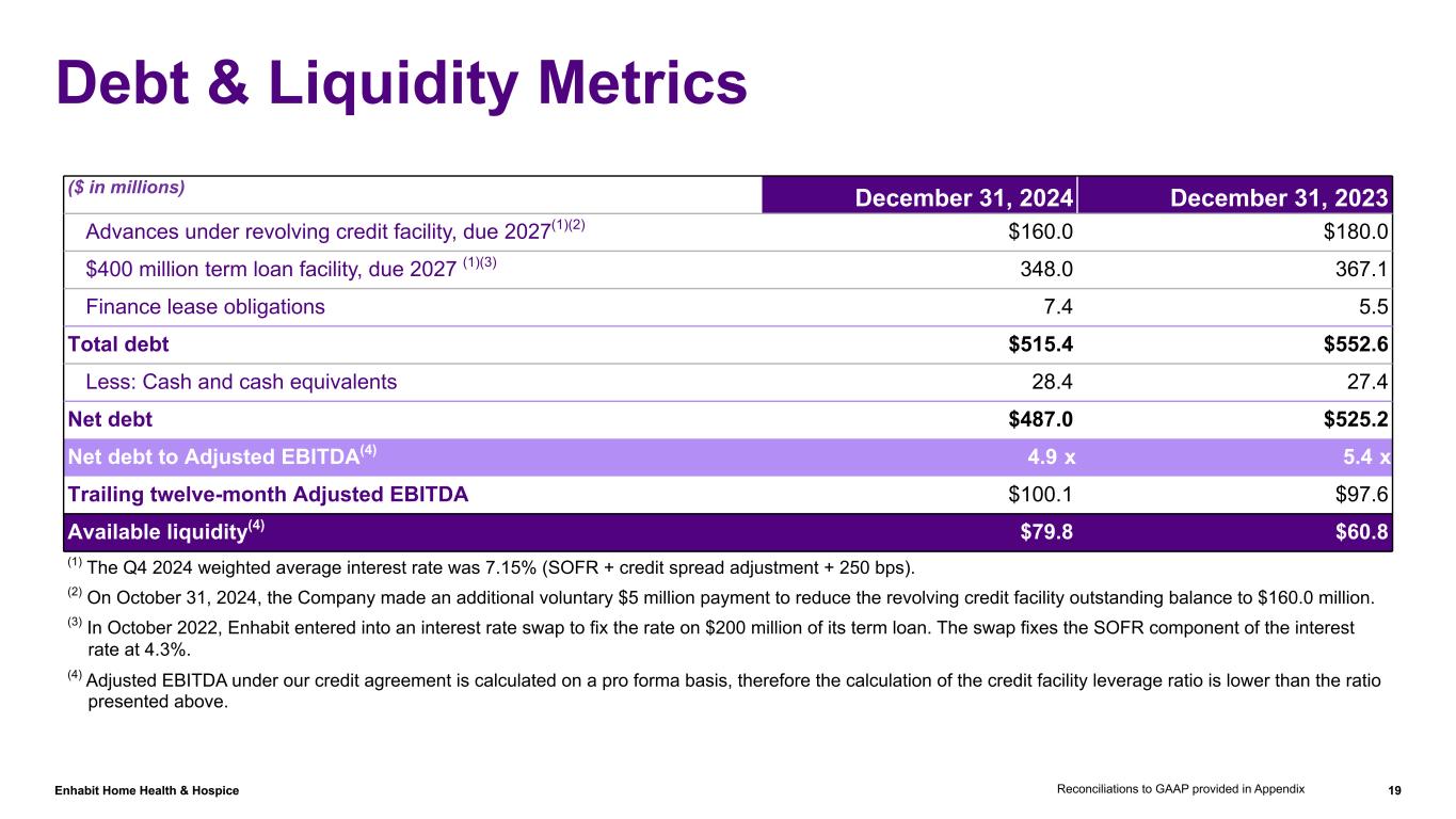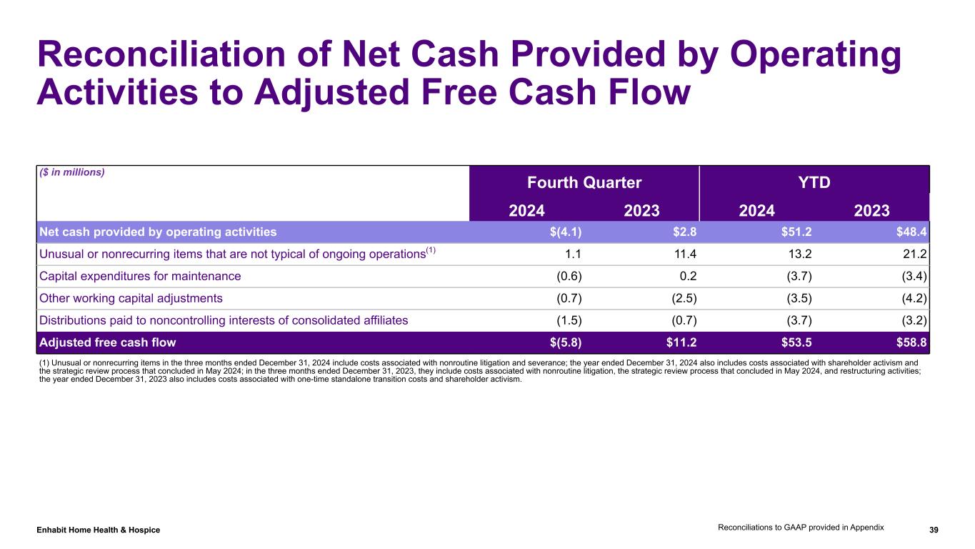 Enhabit Home Health & Hospice 38 Reconciliation of Net Cash Provided by Operating Activities to Adjusted EBITDA ($ in millions) Fourth Quarter YTD 2024 2023 2024 2023 Net cash provided by operating activities $(4.1) $2.8 $51.2 $48.4 Interest expense excluding amortization of debt discounts and fees 9.7 11.2 41.4 40.9 Current portion of (benefit from) provision for income taxes 0.2 (3.0) 1.7 0.2 Change in assets and liabilities, excluding derivative instrument 18.4 3.1 (5.2) (11.9) Net income attributable to noncontrolling interests (0.2) (0.5) (2.2) (1.5) Unusual or nonrecurring items that are not typical of ongoing operations 1.1 11.4 13.2 21.2 Other — 0.2 — 0.3 Adjusted EBITDA $25.1 $25.2 $100.1 $97.6 (1) Unusual or nonrecurring items in the three months ended December 31, 2024 include costs associated with nonroutine litigation and severance; the year ended December 31, 2024 also includes costs associated with shareholder activism and the strategic review process that concluded in May 2024; in the three months ended December 31, 2023, they include costs associated with nonroutine litigation, the strategic review process that concluded in May 2024, and restructuring activities; the year ended December 31, 2023 also includes costs associated with one-time standalone transition costs and shareholder activism. Reconciliations to GAAP provided in Appendix