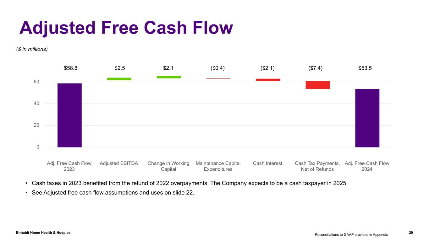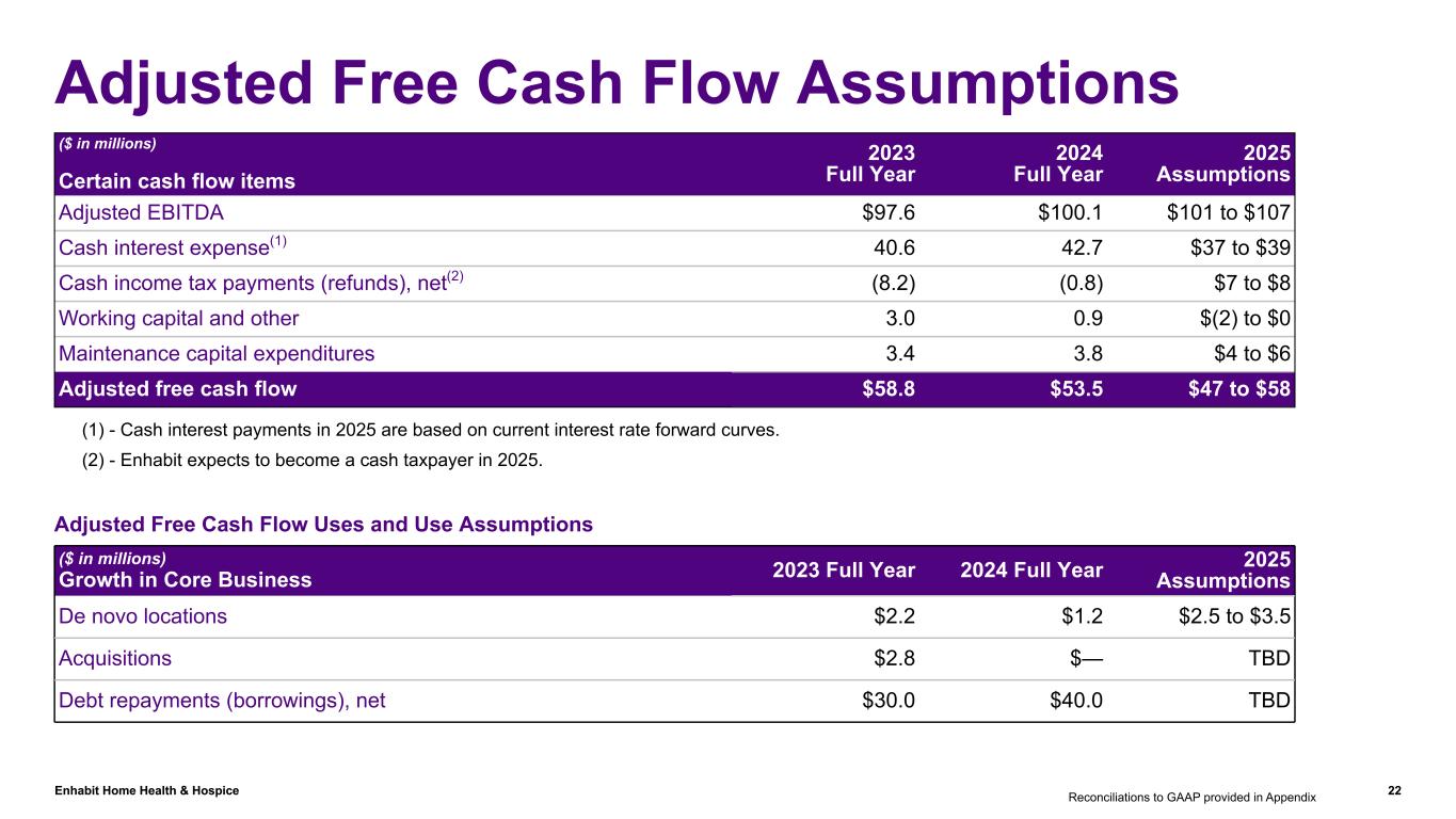 Enhabit Home Health & Hospice 22 Adjusted Free Cash Flow Assumptions ($ in millions) Certain cash flow items 2023 Full Year 2024 Full Year 2025 Assumptions Adjusted EBITDA $97.6 $100.1 $101 to $107 Cash interest expense(1) 40.6 42.7 $37 to $39 Cash income tax payments (refunds), net(2) (8.2) (0.8) $7 to $8 Working capital and other 3.0 0.9 $(2) to $0 Maintenance capital expenditures 3.4 3.8 $4 to $6 Adjusted free cash flow $58.8 $53.5 $47 to $58 Reconciliations to GAAP provided in Appendix (1) - Cash interest payments in 2025 are based on current interest rate forward curves. (2) - Enhabit expects to become a cash taxpayer in 2025. ($ in millions) Growth in Core Business 2023 Full Year 2024 Full Year 2025 Assumptions De novo locations $2.2 $1.2 $2.5 to $3.5 Acquisitions $2.8 $— TBD Debt repayments (borrowings), net $30.0 $40.0 TBD Adjusted Free Cash Flow Uses and Use Assumptions