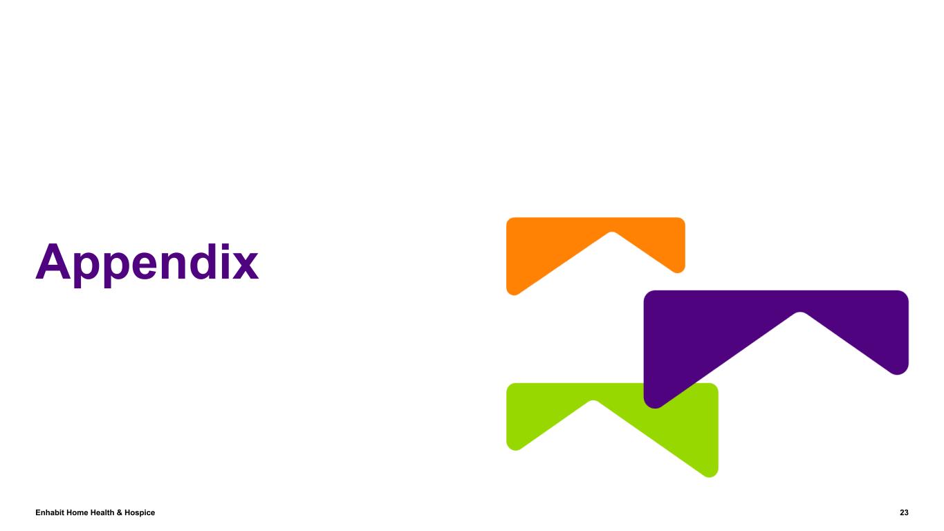 Enhabit Home Health & Hospice 21 2025 Guidance ($ in millions, except per share data) 2024 Actuals 2025 Guidance Net service revenue $1,034.8 $1,050 to $1,080 Adjusted EBITDA $100.1 $101 to $107 Adjusted EPS $0.21 $0.41 to $0.51 Guidance Considerations Tax rate: approximately 25% Diluted share count: approximately 51.6 million shares Home Health considerations Volume (ADC): increase of 4% to 5% Unit revenue (per patient day): decrease of 0.5% to flat Cost per day: increase of 2% to 3% Other: continued shift to more non-Medicare admissions Hospice considerations Volume (ADC): increase of 7% to 8.5% Unit revenue (per patient day): increase of 4% to 5% Cost per patient day: increase of 2% to 3% Reconciliations to GAAP provided in Appendix