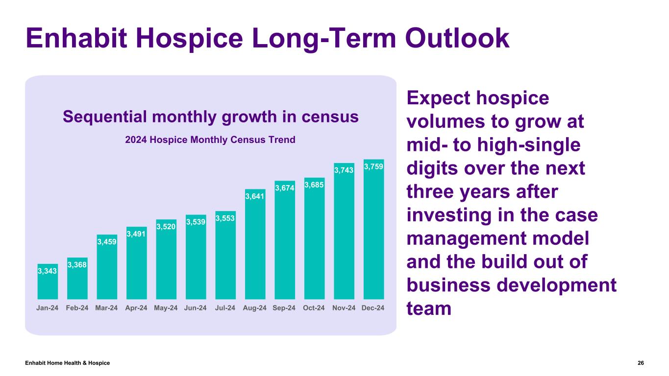 Enhabit Home Health & Hospice 25 Enhabit Home Health Long-Term Outlook Q4 2024 Home health admission growth was impacted by hurricanes and contract negotiations with a national payer. We expect to continue growing at mid- to high-single digits over the next three years with our ability to better serve referral sources through improved clinical capacity and payer innovation contracts. Normalized Q4 Home health admissions continue to increase mid-single digits Home Health Admissions Growth vs Prior Year 1.2% 3.2% 1.6% 3.9% 5.3% 6.4% 5.6% 1.8% 2.7% 0.9% —% 1.7% 0.2% 3.2% 5.0% 6.2% 5.5% 1.7% 2.7% 0.9% Q1 23 Q2 23 Q3 23 Q4 23 Q1 24 Q2 24 Q3 24 Q4 24 Total admissions growth Same-store admissions growth Replacement impact Storm impact 5.4% 5.3%