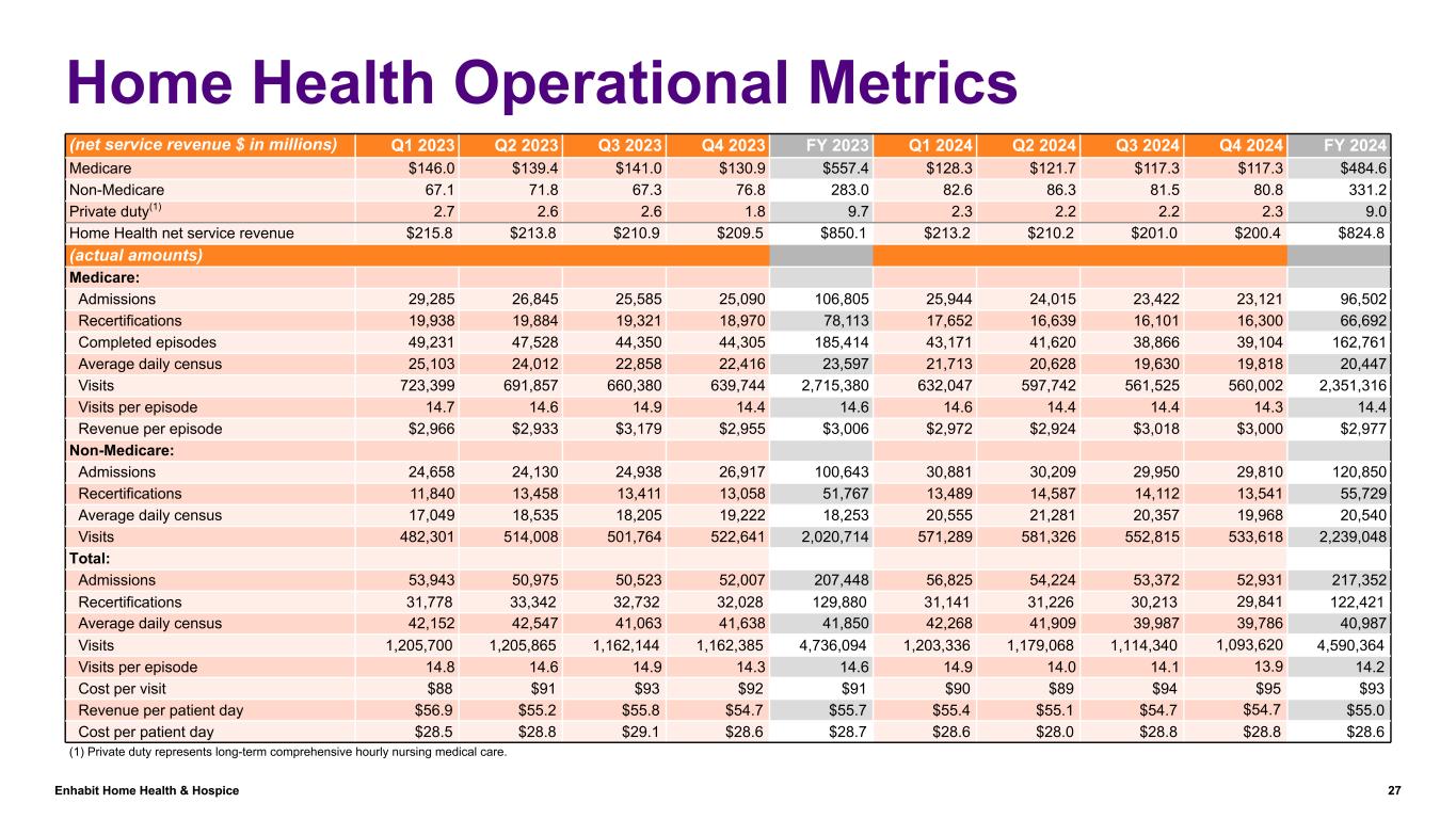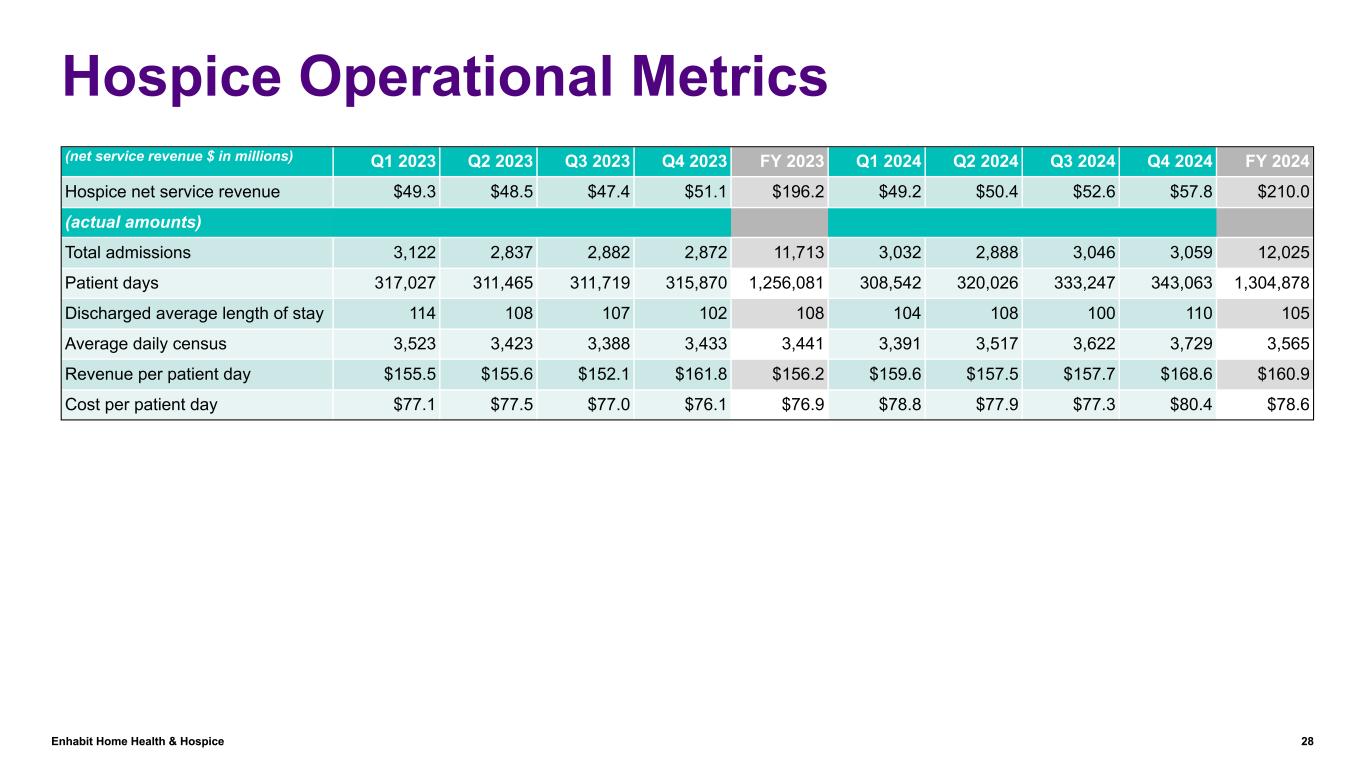 Enhabit Home Health & Hospice 27 Home Health Operational Metrics (net service revenue $ in millions) Q1 2023 Q2 2023 Q3 2023 Q4 2023 FY 2023 Q1 2024 Q2 2024 Q3 2024 Q4 2024 FY 2024 Medicare $146.0 $139.4 $141.0 $130.9 $557.4 $128.3 $121.7 $117.3 $117.3 $484.6 Non-Medicare 67.1 71.8 67.3 76.8 283.0 82.6 86.3 81.5 80.8 331.2 Private duty(1) 2.7 2.6 2.6 1.8 9.7 2.3 2.2 2.2 2.3 9.0 Home Health net service revenue $215.8 $213.8 $210.9 $209.5 $850.1 $213.2 $210.2 $201.0 $200.4 $824.8 (actual amounts) Medicare: Admissions 29,285 26,845 25,585 25,090 106,805 25,944 24,015 23,422 23,121 96,502 Recertifications 19,938 19,884 19,321 18,970 78,113 17,652 16,639 16,101 16,300 66,692 Completed episodes 49,231 47,528 44,350 44,305 185,414 43,171 41,620 38,866 39,104 162,761 Average daily census 25,103 24,012 22,858 22,416 23,597 21,713 20,628 19,630 19,818 20,447 Visits 723,399 691,857 660,380 639,744 2,715,380 632,047 597,742 561,525 560,002 2,351,316 Visits per episode 14.7 14.6 14.9 14.4 14.6 14.6 14.4 14.4 14.3 14.4 Revenue per episode $2,966 $2,933 $3,179 $2,955 $3,006 $2,972 $2,924 $3,018 $3,000 $2,977 Non-Medicare: Admissions 24,658 24,130 24,938 26,917 100,643 30,881 30,209 29,950 29,810 120,850 Recertifications 11,840 13,458 13,411 13,058 51,767 13,489 14,587 14,112 13,541 55,729 Average daily census 17,049 18,535 18,205 19,222 18,253 20,555 21,281 20,357 19,968 20,540 Visits 482,301 514,008 501,764 522,641 2,020,714 571,289 581,326 552,815 533,618 2,239,048 Total: Admissions 53,943 50,975 50,523 52,007 207,448 56,825 54,224 53,372 52,931 217,352 Recertifications 31,778 33,342 32,732 32,028 129,880 31,141 31,226 30,213 29,841 122,421 Average daily census 42,152 42,547 41,063 41,638 41,850 42,268 41,909 39,987 39,786 40,987 Visits 1,205,700 1,205,865 1,162,144 1,162,385 4,736,094 1,203,336 1,179,068 1,114,340 1,093,620 4,590,364 Visits per episode 14.8 14.6 14.9 14.3 14.6 14.9 14.0 14.1 13.9 14.2 Cost per visit $88 $91 $93 $92 $91 $90 $89 $94 $95 $93 Revenue per patient day $56.9 $55.2 $55.8 $54.7 $55.7 $55.4 $55.1 $54.7 $54.7 $55.0 Cost per patient day $28.5 $28.8 $29.1 $28.6 $28.7 $28.6 $28.0 $28.8 $28.8 $28.6 (1) Private duty represents long-term comprehensive hourly nursing medical care.