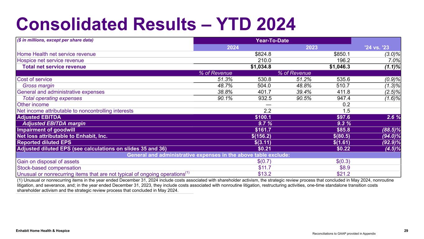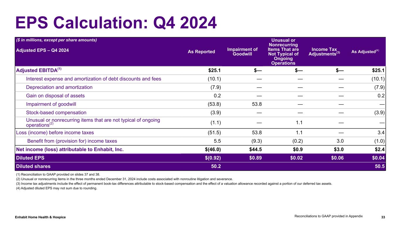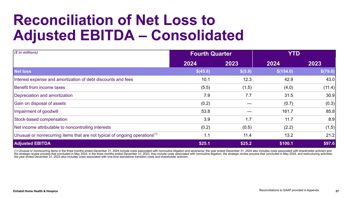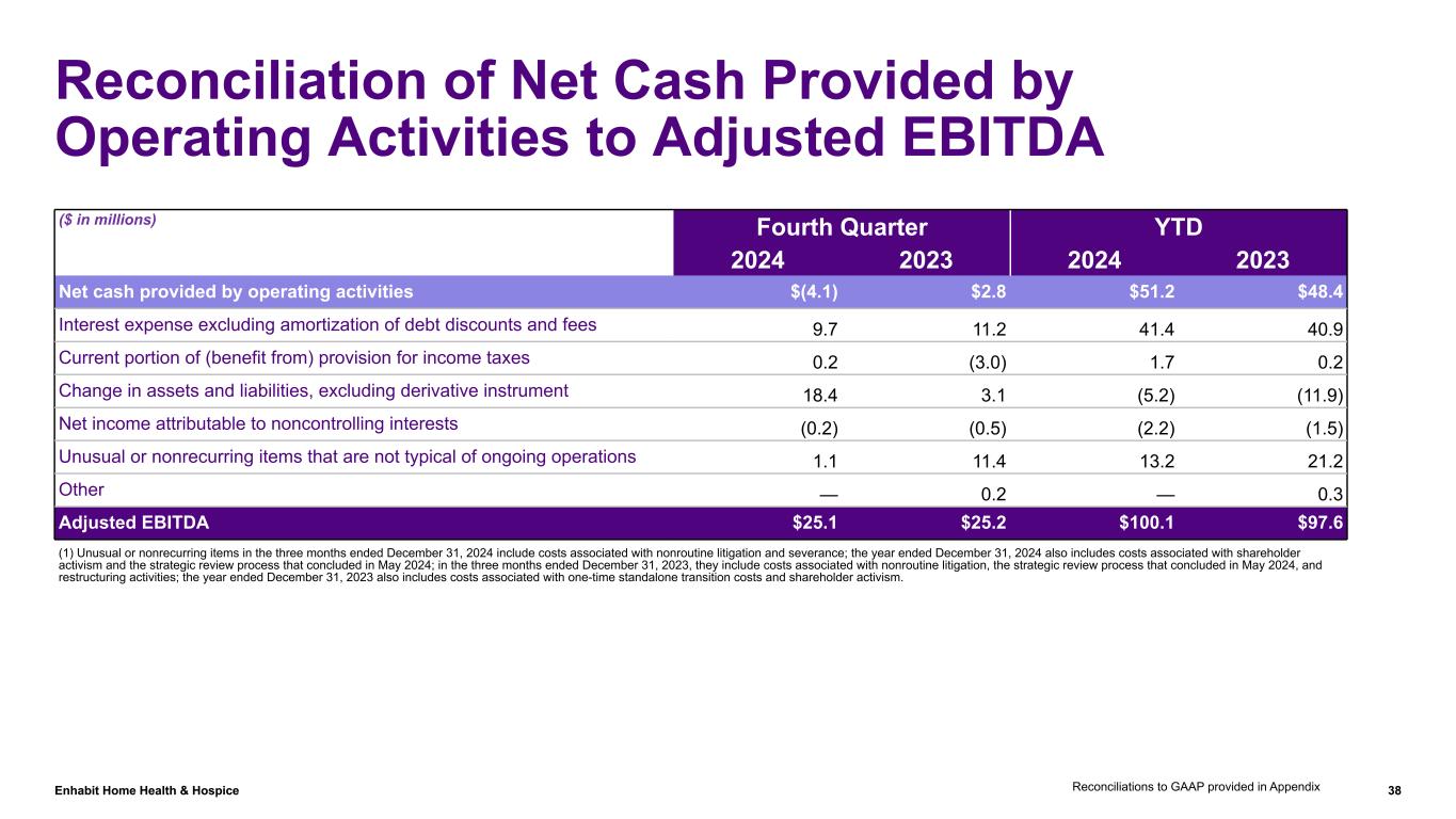 Enhabit Home Health & Hospice 37 Reconciliation of Net Loss to Adjusted EBITDA – Consolidated ($ in millions) Fourth Quarter YTD 2024 2023 2024 2023 Net loss $(45.8) $(5.9) $(154.0) $(79.0) Interest expense and amortization of debt discounts and fees 10.1 12.3 42.9 43.0 Benefit from income taxes (5.5) (1.5) (4.0) (11.4) Depreciation and amortization 7.9 7.7 31.5 30.9 Gain on disposal of assets (0.2) — (0.7) (0.3) Impairment of goodwill 53.8 — 161.7 85.8 Stock-based compensation 3.9 1.7 11.7 8.9 Net income attributable to noncontrolling interests (0.2) (0.5) (2.2) (1.5) Unusual or nonrecurring items that are not typical of ongoing operations(1) 1.1 11.4 13.2 21.2 Adjusted EBITDA $25.1 $25.2 $100.1 $97.6 (1) Unusual or nonrecurring items in the three months ended December 31, 2024 include costs associated with nonroutine litigation and severance; the year ended December 31, 2024 also includes costs associated with shareholder activism and the strategic review process that concluded in May 2024; in the three months ended December 31, 2023, they include costs associated with nonroutine litigation, the strategic review process that concluded in May 2024, and restructuring activities; the year ended December 31, 2023 also includes costs associated with one-time standalone transition costs and shareholder activism. Reconciliations to GAAP provided in Appendix
