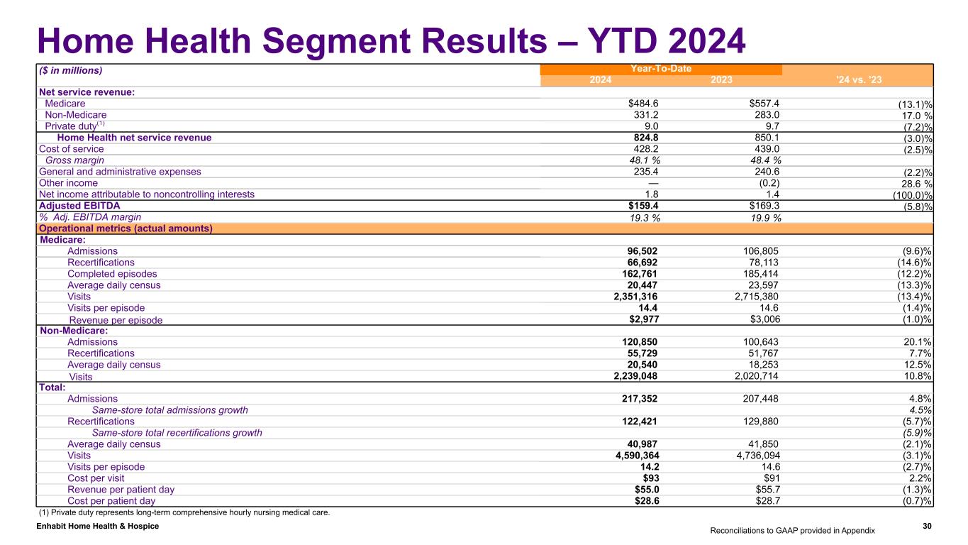 Enhabit Home Health & Hospice 29 Consolidated Results – YTD 2024 ($ in millions, except per share data) Year-To-Date '24 vs. '232024 2023 Home Health net service revenue $824.8 $850.1 (3.0) % Hospice net service revenue 210.0 196.2 7.0 % Total net service revenue $1,034.8 $1,046.3 (1.1) % % of Revenue % of Revenue Cost of service 51.3 % 530.8 51.2 % 535.6 (0.9) % Gross margin 48.7 % 504.0 48.8 % 510.7 (1.3) % General and administrative expenses 38.8 % 401.7 39.4 % 411.8 (2.5) % Total operating expenses 90.1 % 932.5 90.5 % 947.4 (1.6) % Other income — 0.2 Net income attributable to noncontrolling interests 2.2 1.5 Adjusted EBITDA $100.1 $97.6 2.6 % Adjusted EBITDA margin 9.7 % 9.3 % Impairment of goodwill $161.7 $85.8 (88.5) % Net loss attributable to Enhabit, Inc. $(156.2) $(80.5) (94.0) % Reported diluted EPS $(3.11) $(1.61) (92.9) % Adjusted diluted EPS (see calculations on slides 35 and 36) $0.21 $0.22 (4.5) % General and administrative expenses in the above table exclude: Gain on disposal of assets $(0.7) $(0.3) Stock-based compensation $11.7 $8.9 Unusual or nonrecurring items that are not typical of ongoing operations(1) $13.2 $21.2 (1) Unusual or nonrecurring items in the year ended December 31, 2024 include costs associated with shareholder activism, the strategic review process that concluded in May 2024, nonroutine litigation, and severance, and; in the year ended December 31, 2023, they include costs associated with nonroutine litigation, restructuring activities, one-time standalone transition costs shareholder activism and the strategic review process that concluded in May 2024. Reconciliations to GAAP provided in Appendix