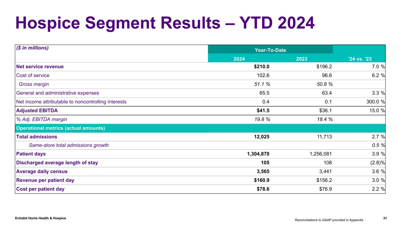 Enhabit Home Health & Hospice 30 Home Health Segment Results – YTD 2024 ($ in millions) Year-To-Date '24 vs. '232024 2023 Net service revenue: Medicare $484.6 $557.4 (13.1) % Non-Medicare 331.2 283.0 17.0 % Private duty(1) 9.0 9.7 (7.2) % Home Health net service revenue 824.8 850.1 (3.0) % Cost of service 428.2 439.0 (2.5) % Gross margin 48.1 % 48.4 % General and administrative expenses 235.4 240.6 (2.2) % Other income — (0.2) 28.6 % Net income attributable to noncontrolling interests 1.8 1.4 (100.0) % Adjusted EBITDA $159.4 $169.3 (5.8) % % Adj. EBITDA margin 19.3 % 19.9 % Operational metrics (actual amounts) Medicare: Admissions 96,502 106,805 (9.6) % Recertifications 66,692 78,113 (14.6) % Completed episodes 162,761 185,414 (12.2) % Average daily census 20,447 23,597 (13.3) % Visits 2,351,316 2,715,380 (13.4) % Visits per episode 14.4 14.6 (1.4) % Revenue per episode $2,977 $3,006 (1.0) % Non-Medicare: Admissions 120,850 100,643 20.1 % Recertifications 55,729 51,767 7.7 % Average daily census 20,540 18,253 12.5 % Visits 2,239,048 2,020,714 10.8 % Total: Admissions 217,352 207,448 4.8 % Same-store total admissions growth 4.5 % Recertifications 122,421 129,880 (5.7) % Same-store total recertifications growth (5.9) % Average daily census 40,987 41,850 (2.1) % Visits 4,590,364 4,736,094 (3.1) % Visits per episode 14.2 14.6 (2.7) % Cost per visit $93 $91 2.2 % Revenue per patient day $55.0 $55.7 (1.3) % Cost per patient day $28.6 $28.7 (0.7) % (1) Private duty represents long-term comprehensive hourly nursing medical care. Reconciliations to GAAP provided in Appendix