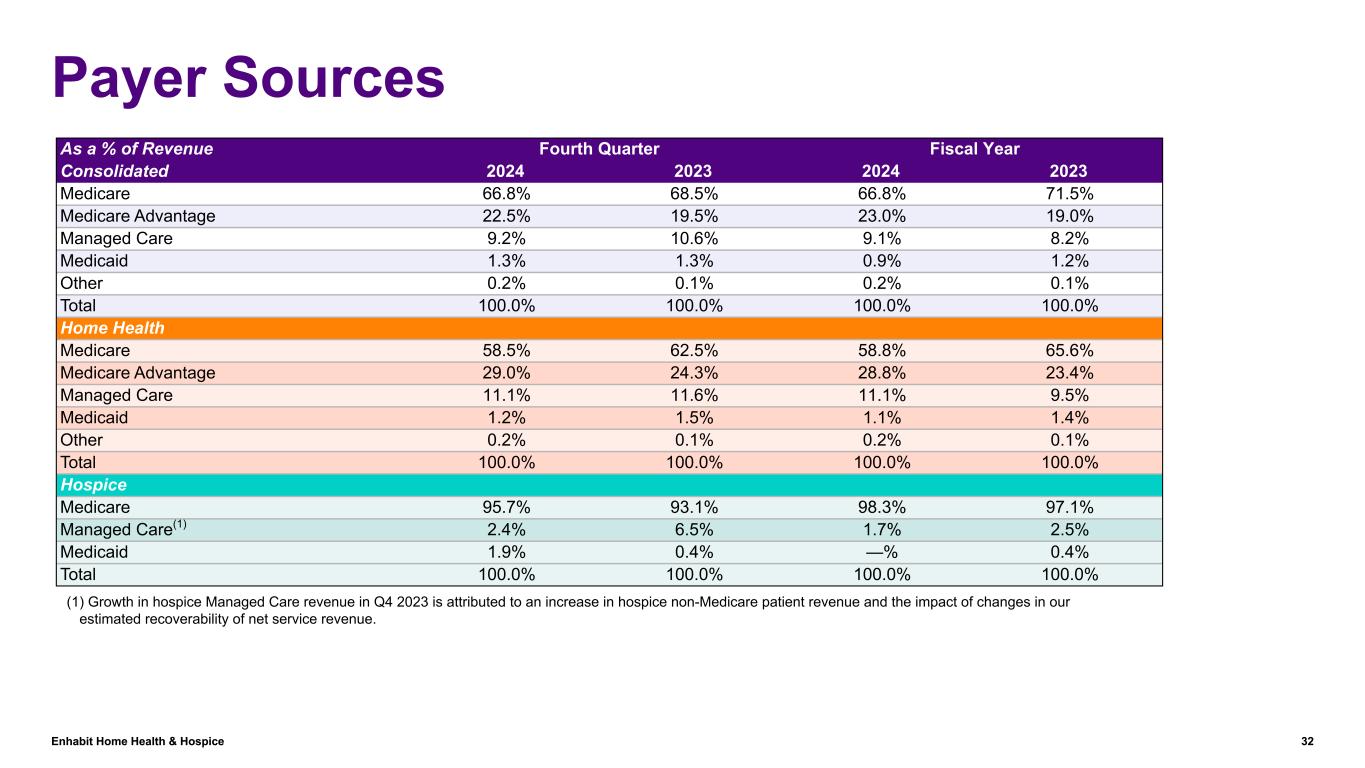 Enhabit Home Health & Hospice 32 Payer Sources As a % of Revenue Fourth Quarter Fiscal Year Consolidated 2024 2023 2024 2023 Medicare 66.8% 68.5% 66.8% 71.5% Medicare Advantage 22.5% 19.5% 23.0% 19.0% Managed Care 9.2% 10.6% 9.1% 8.2% Medicaid 1.3% 1.3% 0.9% 1.2% Other 0.2% 0.1% 0.2% 0.1% Total 100.0% 100.0% 100.0% 100.0% Home Health Medicare 58.5% 62.5% 58.8% 65.6% Medicare Advantage 29.0% 24.3% 28.8% 23.4% Managed Care 11.1% 11.6% 11.1% 9.5% Medicaid 1.2% 1.5% 1.1% 1.4% Other 0.2% 0.1% 0.2% 0.1% Total 100.0% 100.0% 100.0% 100.0% Hospice Medicare 95.7% 93.1% 98.3% 97.1% Managed Care(1) 2.4% 6.5% 1.7% 2.5% Medicaid 1.9% 0.4% —% 0.4% Total 100.0% 100.0% 100.0% 100.0% (1) Growth in hospice Managed Care revenue in Q4 2023 is attributed to an increase in hospice non-Medicare patient revenue and the impact of changes in our estimated recoverability of net service revenue.
