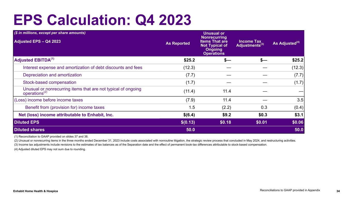 Enhabit Home Health & Hospice 33 EPS Calculation: Q4 2024 ($ in millions, except per share amounts) Adjusted EPS – Q4 2024 As Reported Impairment of Goodwill Unusual or Nonrecurring Items That are Not Typical of Ongoing Operations Income Tax Adjustments(3) As Adjusted(4) Adjusted EBITDA(1) $25.1 $— $— $— $25.1 Interest expense and amortization of debt discounts and fees (10.1) — — — (10.1) Depreciation and amortization (7.9) — — — (7.9) Gain on disposal of assets 0.2 — — — 0.2 Impairment of goodwill (53.8) 53.8 — — — Stock-based compensation (3.9) — — — (3.9) Unusual or nonrecurring items that are not typical of ongoing operations(2) (1.1) — 1.1 — — Loss (income) before income taxes (51.5) 53.8 1.1 — 3.4 Benefit from (provision for) income taxes 5.5 (9.3) (0.2) 3.0 (1.0) Net income (loss) attributable to Enhabit, Inc. $(46.0) $44.5 $0.9 $3.0 $2.4 Diluted EPS $(0.92) $0.89 $0.02 $0.06 $0.04 Diluted shares 50.2 50.5 (1) Reconciliation to GAAP provided on slides 37 and 38. (2) Unusual or nonrecurring items in the three months ended December 31, 2024 include costs associated with nonroutine litigation and severance. (3) Income tax adjustments include the effect of permanent book-tax differences attributable to stock-based compensation and the effect of a valuation allowance recorded against a portion of our deferred tax assets. (4) Adjusted diluted EPS may not sum due to rounding. Reconciliations to GAAP provided in Appendix