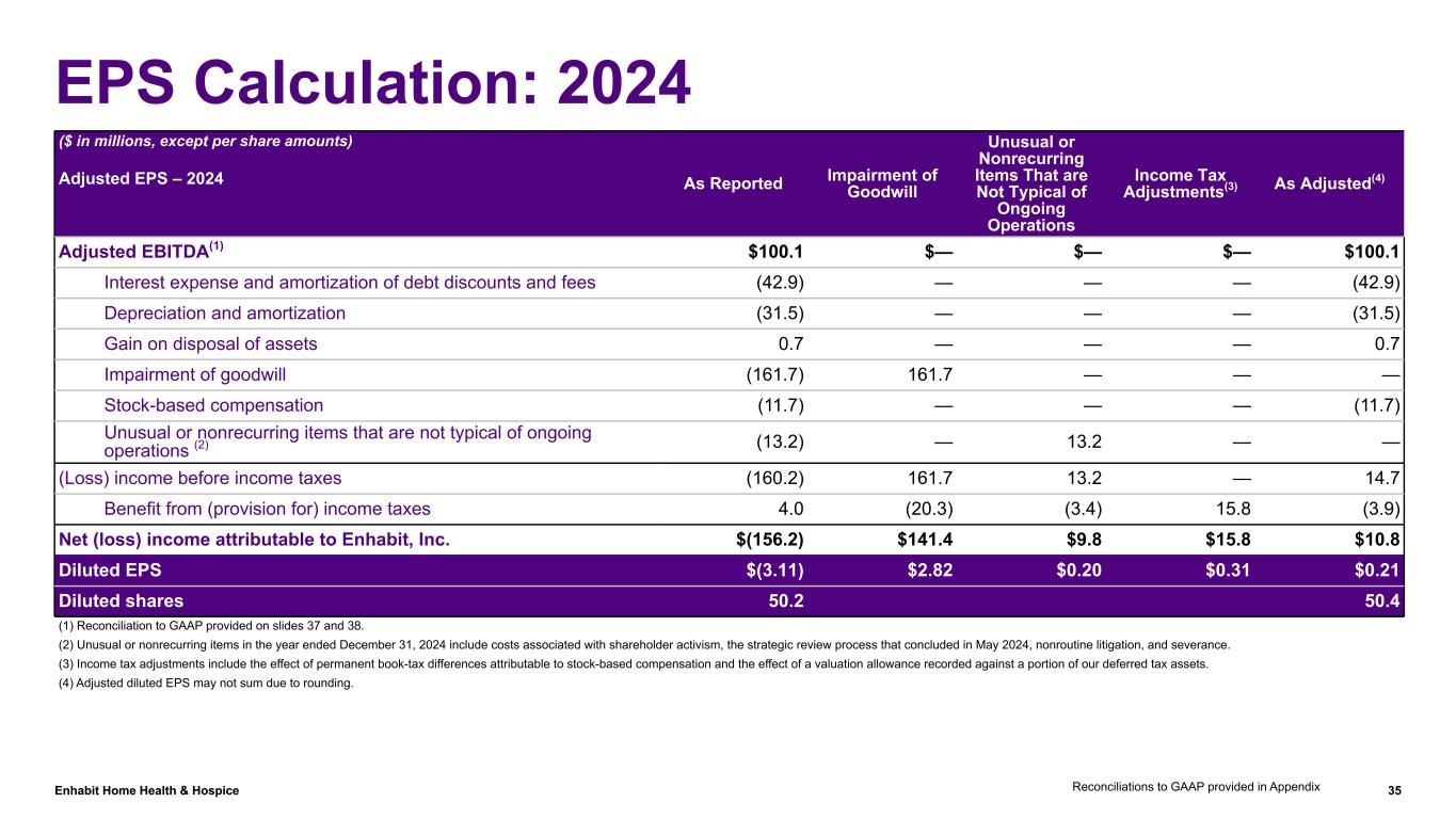 Enhabit Home Health & Hospice 34 EPS Calculation: Q4 2023 ($ in millions, except per share amounts) Adjusted EPS – Q4 2023 As Reported Unusual or Nonrecurring Items That are Not Typical of Ongoing Operations Income Tax Adjustments(3) As Adjusted(4) Adjusted EBITDA(1) $25.2 $— $— $25.2 Interest expense and amortization of debt discounts and fees (12.3) — — (12.3) Depreciation and amortization (7.7) — — (7.7) Stock-based compensation (1.7) — — (1.7) Unusual or nonrecurring items that are not typical of ongoing operations(2) (11.4) 11.4 — — (Loss) income before income taxes (7.9) 11.4 — 3.5 Benefit from (provision for) income taxes 1.5 (2.2) 0.3 (0.4) Net (loss) income attributable to Enhabit, Inc. $(6.4) $9.2 $0.3 $3.1 Diluted EPS $(0.13) $0.18 $0.01 $0.06 Diluted shares 50.0 50.0 (1) Reconciliation to GAAP provided on slides 37 and 38. (2) Unusual or nonrecurring items in the three months ended December 31, 2023 include costs associated with nonroutine litigation, the strategic review process that concluded in May 2024, and restructuring activities. (3) Income tax adjustments include revisions to the estimates of tax balances as of the Separation date and the effect of permanent book-tax differences attributable to stock-based compensation. (4) Adjusted diluted EPS may not sum due to rounding. Reconciliations to GAAP provided in Appendix