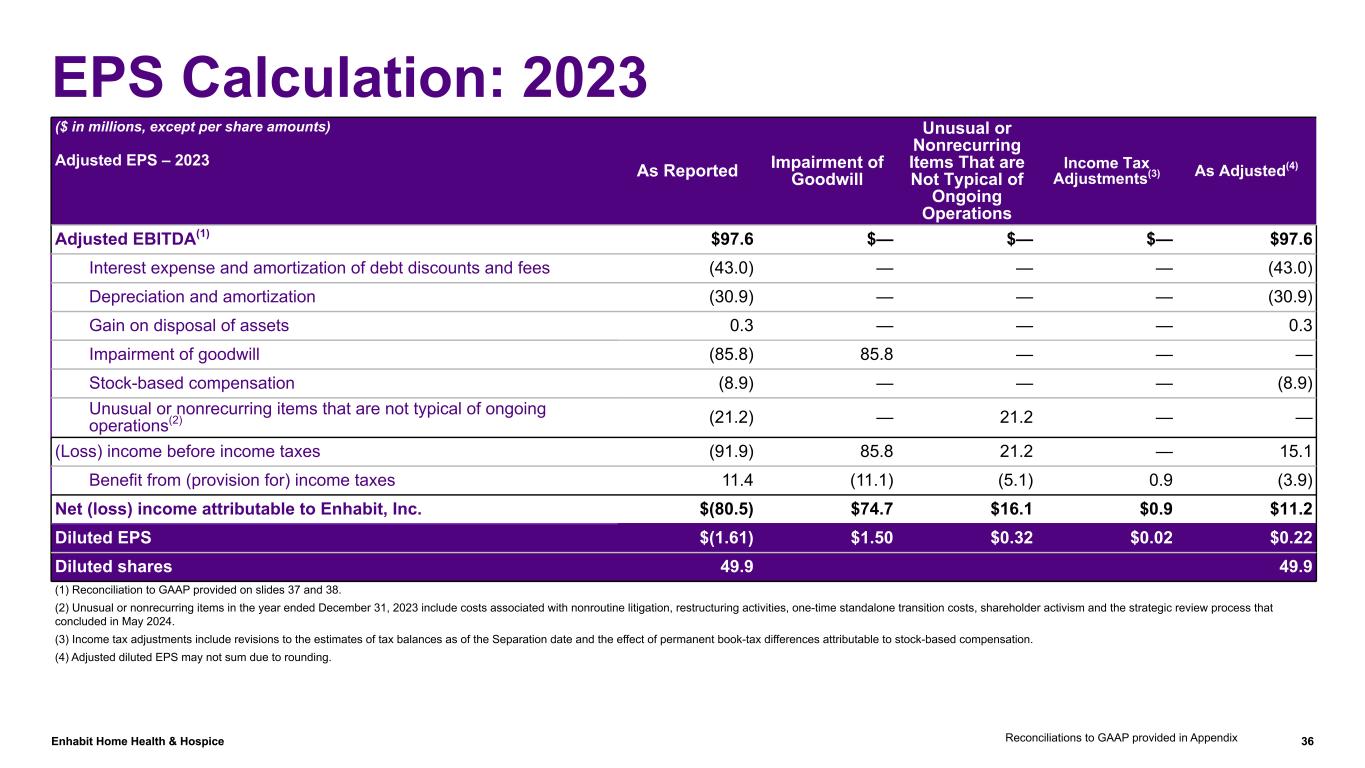 Enhabit Home Health & Hospice 35 EPS Calculation: 2024 ($ in millions, except per share amounts) Adjusted EPS – 2024 As Reported Impairment of Goodwill Unusual or Nonrecurring Items That are Not Typical of Ongoing Operations Income Tax Adjustments(3) As Adjusted(4) Adjusted EBITDA(1) $100.1 $— $— $— $100.1 Interest expense and amortization of debt discounts and fees (42.9) — — — (42.9) Depreciation and amortization (31.5) — — — (31.5) Gain on disposal of assets 0.7 — — — 0.7 Impairment of goodwill (161.7) 161.7 — — — Stock-based compensation (11.7) — — — (11.7) Unusual or nonrecurring items that are not typical of ongoing operations (2) (13.2) — 13.2 — — (Loss) income before income taxes (160.2) 161.7 13.2 — 14.7 Benefit from (provision for) income taxes 4.0 (20.3) (3.4) 15.8 (3.9) Net (loss) income attributable to Enhabit, Inc. $(156.2) $141.4 $9.8 $15.8 $10.8 Diluted EPS $(3.11) $2.82 $0.20 $0.31 $0.21 Diluted shares 50.2 50.4 (1) Reconciliation to GAAP provided on slides 37 and 38. (2) Unusual or nonrecurring items in the year ended December 31, 2024 include costs associated with shareholder activism, the strategic review process that concluded in May 2024, nonroutine litigation, and severance. (3) Income tax adjustments include the effect of permanent book-tax differences attributable to stock-based compensation and the effect of a valuation allowance recorded against a portion of our deferred tax assets. (4) Adjusted diluted EPS may not sum due to rounding. Reconciliations to GAAP provided in Appendix