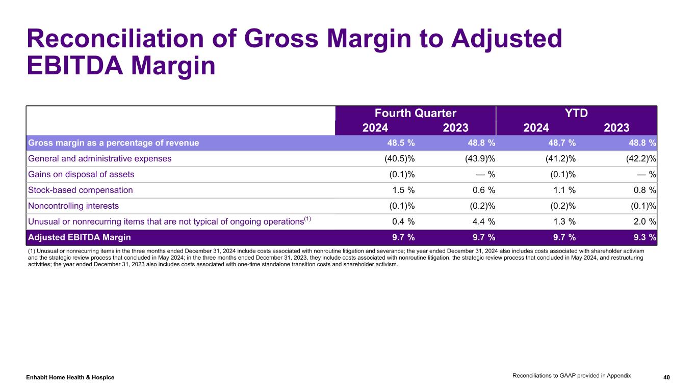 Enhabit Home Health & Hospice 39 Reconciliation of Net Cash Provided by Operating Activities to Adjusted Free Cash Flow PLACE HOLDER – WILL NEED: • EBITDA to Net income • Adjusted EPS to reported EPS and Net income ($ in millions) Fourth Quarter YTD 2024 2023 2024 2023 Net cash provided by operating activities $(4.1) $2.8 $51.2 $48.4 Unusual or nonrecurring items that are not typical of ongoing operations(1) 1.1 11.4 13.2 21.2 Capital expenditures for maintenance (0.6) 0.2 (3.7) (3.4) Other working capital adjustments (0.7) (2.5) (3.5) (4.2) Distributions paid to noncontrolling interests of consolidated affiliates (1.5) (0.7) (3.7) (3.2) Adjusted free cash flow $(5.8) $11.2 $53.5 $58.8 (1) Unusual or nonrecurring items in the three months ended December 31, 2024 include costs associated with nonroutine litigation and severance; the year ended December 31, 2024 also includes costs associated with shareholder activism and the strategic review process that concluded in May 2024; in the three months ended December 31, 2023, they include costs associated with nonroutine litigation, the strategic review process that concluded in May 2024, and restructuring activities; the year ended December 31, 2023 also includes costs associated with one-time standalone transition costs and shareholder activism. Reconciliations to GAAP provided in Appendix