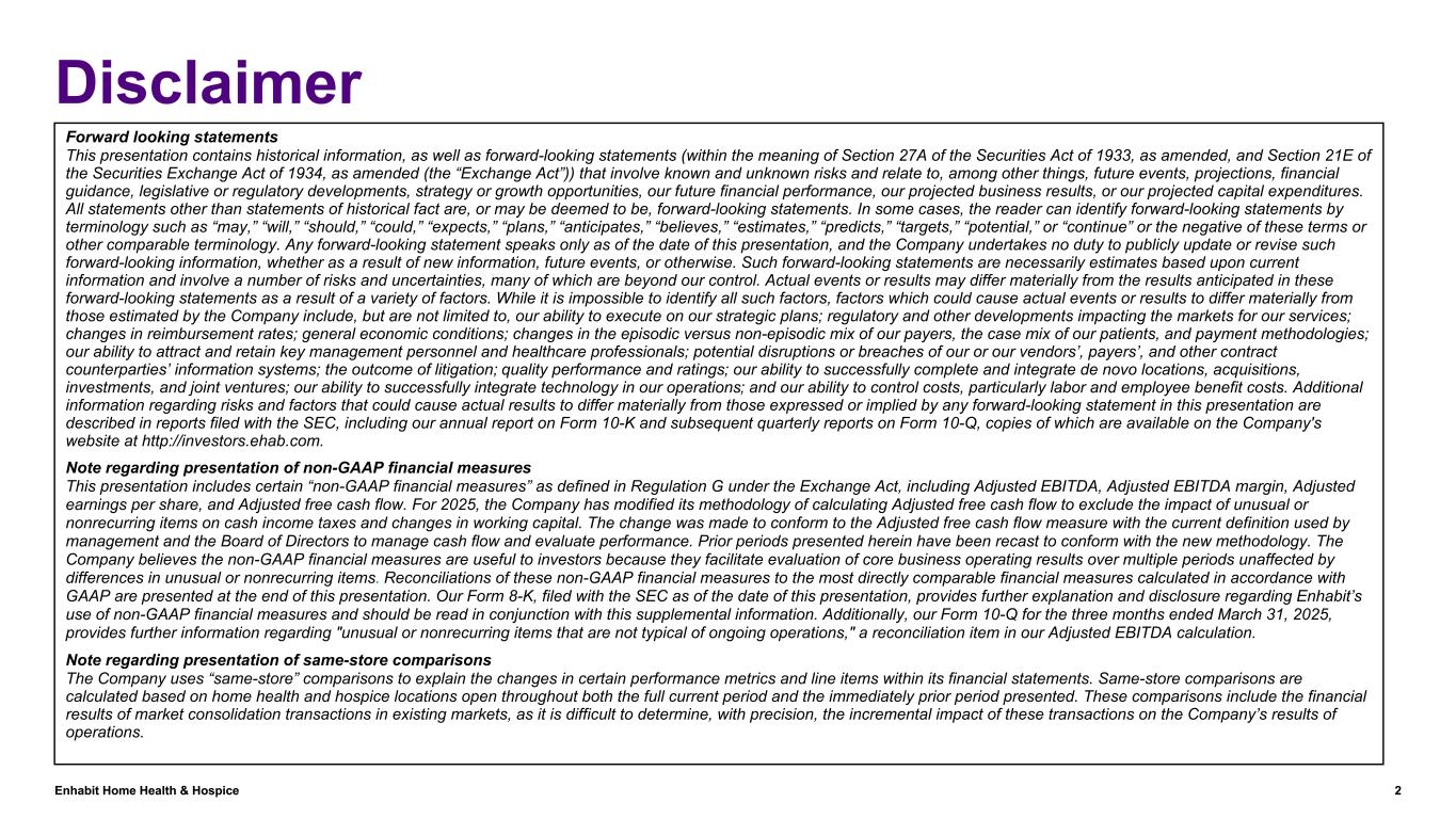 Enhabit Home Health & Hospice 2 Disclaimer Forward looking statements This presentation contains historical information, as well as forward-looking statements (within the meaning of Section 27A of the Securities Act of 1933, as amended, and Section 21E of the Securities Exchange Act of 1934, as amended (the “Exchange Act”)) that involve known and unknown risks and relate to, among other things, future events, projections, financial guidance, legislative or regulatory developments, strategy or growth opportunities, our future financial performance, our projected business results, or our projected capital expenditures. All statements other than statements of historical fact are, or may be deemed to be, forward-looking statements. In some cases, the reader can identify forward-looking statements by terminology such as “may,” “will,” “should,” “could,” “expects,” “plans,” “anticipates,” “believes,” “estimates,” “predicts,” “targets,” “potential,” or “continue” or the negative of these terms or other comparable terminology. Any forward-looking statement speaks only as of the date of this presentation, and the Company undertakes no duty to publicly update or revise such forward-looking information, whether as a result of new information, future events, or otherwise. Such forward-looking statements are necessarily estimates based upon current information and involve a number of risks and uncertainties, many of which are beyond our control. Actual events or results may differ materially from the results anticipated in these forward-looking statements as a result of a variety of factors. While it is impossible to identify all such factors, factors which could cause actual events or results to differ materially from those estimated by the Company include, but are not limited to, our ability to execute on our strategic plans; regulatory and other developments impacting the markets for our services; changes in reimbursement rates; general economic conditions; changes in the episodic versus non-episodic mix of our payers, the case mix of our patients, and payment methodologies; our ability to attract and retain key management personnel and healthcare professionals; potential disruptions or breaches of our or our vendors’, payers’, and other contract counterparties’ information systems; the outcome of litigation; quality performance and ratings; our ability to successfully complete and integrate de novo locations, acquisitions, investments, and joint ventures; our ability to successfully integrate technology in our operations; and our ability to control costs, particularly labor and employee benefit costs. Additional information regarding risks and factors that could cause actual results to differ materially from those expressed or implied by any forward-looking statement in this presentation are described in reports filed with the SEC, including our annual report on Form 10-K and subsequent quarterly reports on Form 10-Q, copies of which are available on the Company's website at http://investors.ehab.com. Note regarding presentation of non-GAAP financial measures This presentation includes certain “non-GAAP financial measures” as defined in Regulation G under the Exchange Act, including Adjusted EBITDA, Adjusted EBITDA margin, Adjusted earnings per share, and Adjusted free cash flow. For 2025, the Company has modified its methodology of calculating Adjusted free cash flow to exclude the impact of unusual or nonrecurring items on cash income taxes and changes in working capital. The change was made to conform to the Adjusted free cash flow measure with the current definition used by management and the Board of Directors to manage cash flow and evaluate performance. Prior periods presented herein have been recast to conform with the new methodology. The Company believes the non-GAAP financial measures are useful to investors because they facilitate evaluation of core business operating results over multiple periods unaffected by differences in unusual or nonrecurring items. Reconciliations of these non-GAAP financial measures to the most directly comparable financial measures calculated in accordance with GAAP are presented at the end of this presentation. Our Form 8-K, filed with the SEC as of the date of this presentation, provides further explanation and disclosure regarding Enhabit’s use of non-GAAP financial measures and should be read in conjunction with this supplemental information. Additionally, our Form 10-Q for the three months ended March 31, 2025, provides further information regarding "unusual or nonrecurring items that are not typical of ongoing operations," a reconciliation item in our Adjusted EBITDA calculation. Note regarding presentation of same-store comparisons The Company uses “same-store” comparisons to explain the changes in certain performance metrics and line items within its financial statements. Same-store comparisons are calculated based on home health and hospice locations open throughout both the full current period and the immediately prior period presented. These comparisons include the financial results of market consolidation transactions in existing markets, as it is difficult to determine, with precision, the incremental impact of these transactions on the Company’s results of operations.