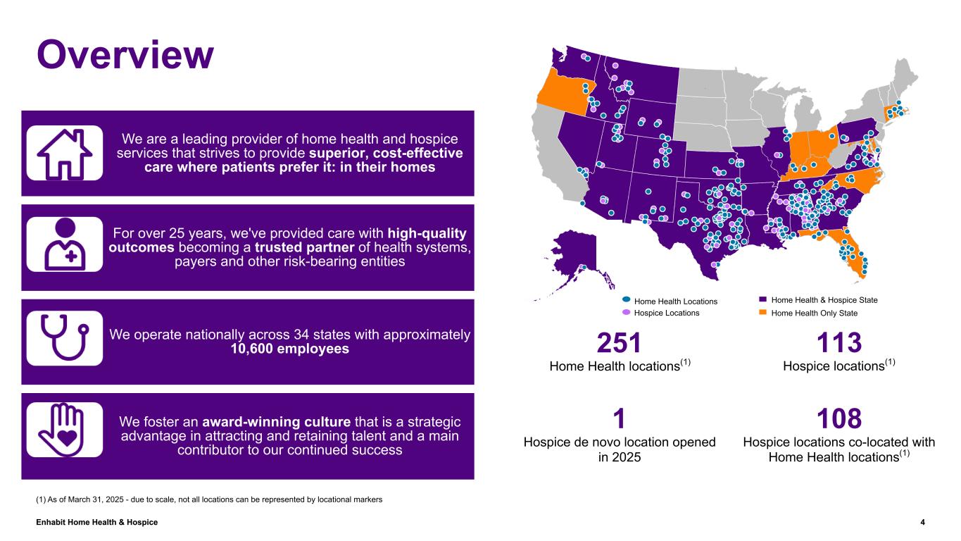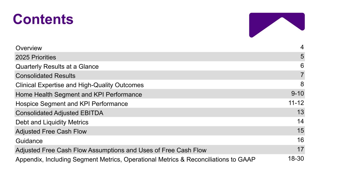 Contents Overview 4 2025 Priorities 5 Quarterly Results at a Glance 6 Consolidated Results 7 Clinical Expertise and High-Quality Outcomes 8 Home Health Segment and KPI Performance 9-10 Hospice Segment and KPI Performance 11-12 Consolidated Adjusted EBITDA 13 Debt and Liquidity Metrics 14 Adjusted Free Cash Flow 15 Guidance 16 Adjusted Free Cash Flow Assumptions and Uses of Free Cash Flow 17 Appendix, Including Segment Metrics, Operational Metrics & Reconciliations to GAAP 18-30