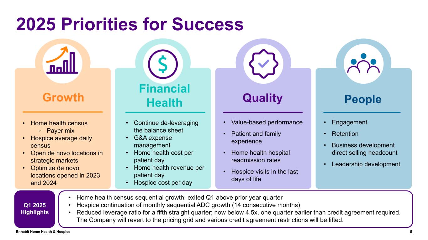 Enhabit Home Health & Hospice 4 Overview 108 Hospice locations co-located with Home Health locations(1) Home Health Locations Hospice Locations Home Health & Hospice State Home Health Only State (1) As of March 31, 2025 - due to scale, not all locations can be represented by locational markers 113 Hospice locations(1) 251 Home Health locations(1) We are a leading provider of home health and hospice services that strives to provide superior, cost-effective care where patients prefer it: in their homes For over 25 years, we've provided care with high-quality outcomes becoming a trusted partner of health systems, payers and other risk-bearing entities We operate nationally across 34 states with approximately 10,600 employees We foster an award-winning culture that is a strategic advantage in attracting and retaining talent and a main contributor to our continued success 1 Hospice de novo location opened in 2025