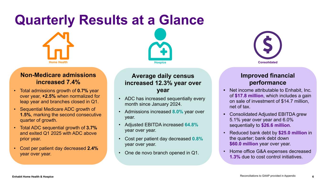 Enhabit Home Health & Hospice 5 2025 Priorities for Success • Home health census ◦ Payer mix • Hospice average daily census • Open de novo locations in strategic markets • Optimize de novo locations opened in 2023 and 2024 • Continue de-leveraging the balance sheet • G&A expense management • Home health cost per patient day • Home health revenue per patient day • Hospice cost per day • Value-based performance • Patient and family experience • Home health hospital readmission rates • Hospice visits in the last days of life • Engagement • Retention • Business development direct selling headcount • Leadership development • Home health census sequential growth; exited Q1 above prior year quarter • Hospice continuation of monthly sequential ADC growth (14 consecutive months) • Reduced leverage ratio for a fifth straight quarter; now below 4.5x, one quarter earlier than credit agreement required. The Company will revert to the pricing grid and various credit agreement restrictions will be lifted. Q1 2025 Highlights
