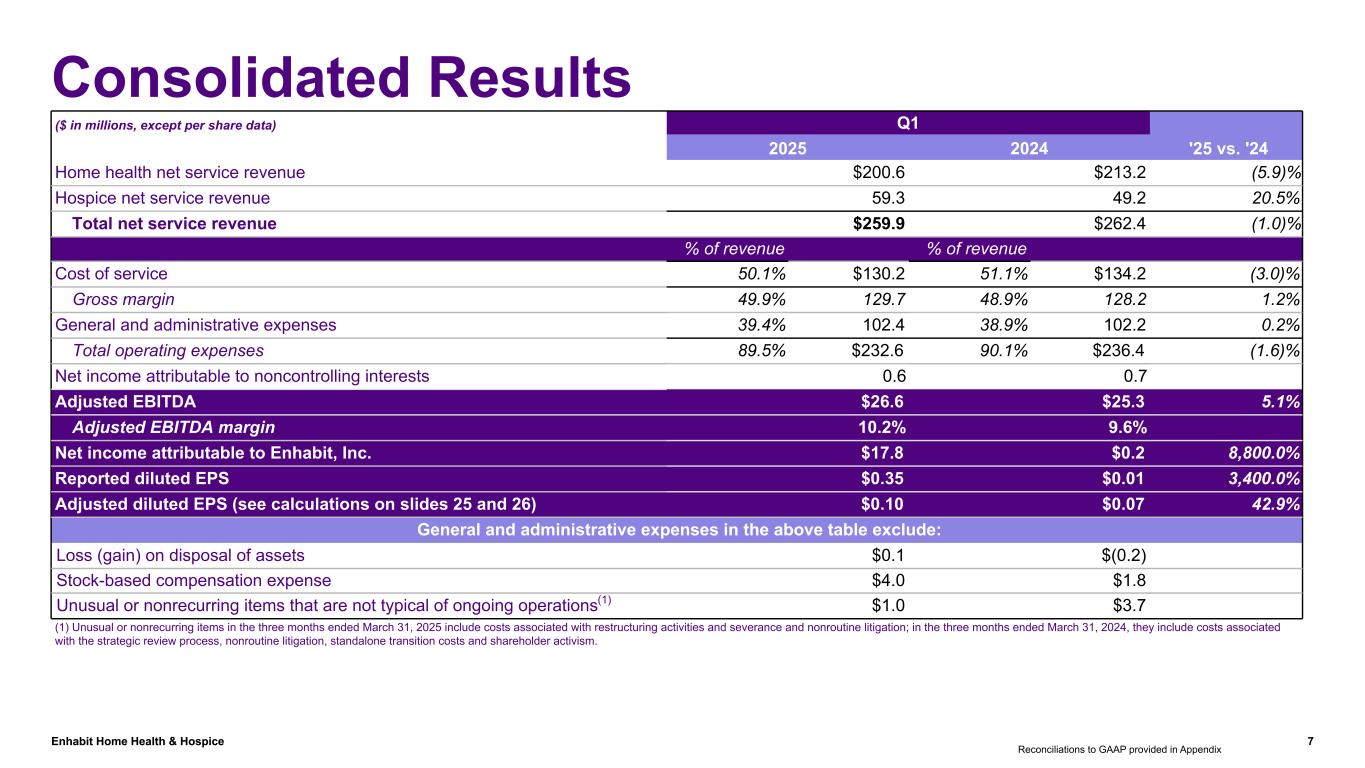 Enhabit Home Health & Hospice 6 Improved financial performance • Net income attributable to Enhabit, Inc. of $17.8 million, which includes a gain on sale of investment of $14.7 million, net of tax. • Consolidated Adjusted EBITDA grew 5.1% year over year and 6.0% sequentially to $26.6 million. • Reduced bank debt by $25.0 million in the quarter; bank debt down $60.0 million year over year. • Home office G&A expenses decreased 1.3% due to cost control initiatives. Reconciliations to GAAP provided in Appendix Quarterly Results at a Glance Non-Medicare admissions increased 7.4% • Total admissions growth of 0.7% year over year, +2.5% when normalized for leap year and branches closed in Q1. • Sequential Medicare ADC growth of 1.5%, marking the second consecutive quarter of growth. • Total ADC sequential growth of 3.7% and exited Q1 2025 with ADC above prior year. • Cost per patient day decreased 2.4% year over year. Average daily census increased 12.3% year over year • ADC has increased sequentially every month since January 2024. • Admissions increased 8.0% year over year. • Adjusted EBITDA increased 64.8% year over year. • Cost per patient day decreased 0.8% year over year. • One de novo branch opened in Q1. Home Health Hospice Consolidated