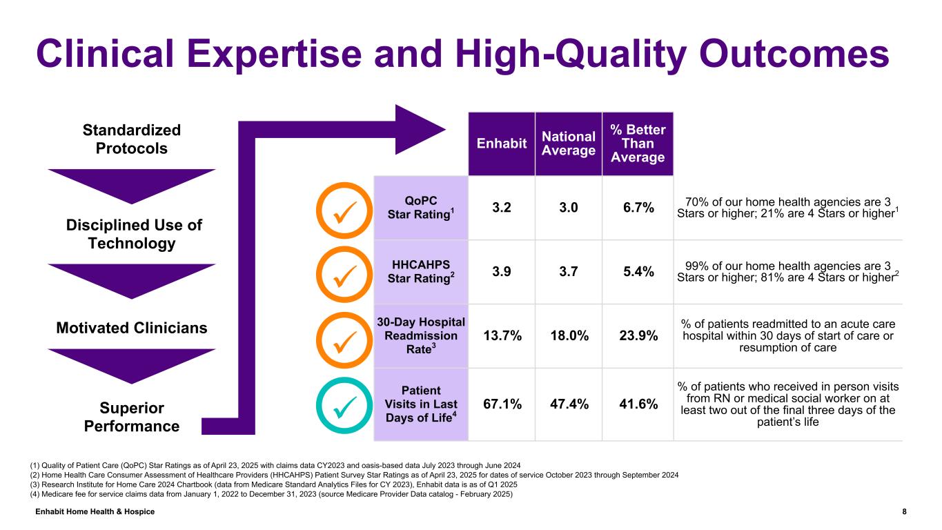 Enhabit Home Health & Hospice 7 Consolidated Results ($ in millions, except per share data) Q1 '25 vs. '242025 2024 Home health net service revenue $200.6 $213.2 (5.9) % Hospice net service revenue 59.3 49.2 20.5 % Total net service revenue $259.9 $262.4 (1.0) % % of revenue % of revenue Cost of service 50.1 % $130.2 51.1 % $134.2 (3.0) % Gross margin 49.9 % 129.7 48.9 % 128.2 1.2 % General and administrative expenses 39.4 % 102.4 38.9 % 102.2 0.2 % Total operating expenses 89.5 % $232.6 90.1 % $236.4 (1.6) % Net income attributable to noncontrolling interests 0.6 0.7 Adjusted EBITDA $26.6 $25.3 5.1 % Adjusted EBITDA margin 10.2 % 9.6 % Net income attributable to Enhabit, Inc. $17.8 $0.2 8,800.0 % Reported diluted EPS $0.35 $0.01 3,400.0 % Adjusted diluted EPS (see calculations on slides 25 and 26) $0.10 $0.07 42.9 % General and administrative expenses in the above table exclude: Loss (gain) on disposal of assets $0.1 $(0.2) Stock-based compensation expense $4.0 $1.8 Unusual or nonrecurring items that are not typical of ongoing operations(1) $1.0 $3.7 (1) Unusual or nonrecurring items in the three months ended March 31, 2025 include costs associated with restructuring activities and severance and nonroutine litigation; in the three months ended March 31, 2024, they include costs associated with the strategic review process, nonroutine litigation, standalone transition costs and shareholder activism. Reconciliations to GAAP provided in Appendix