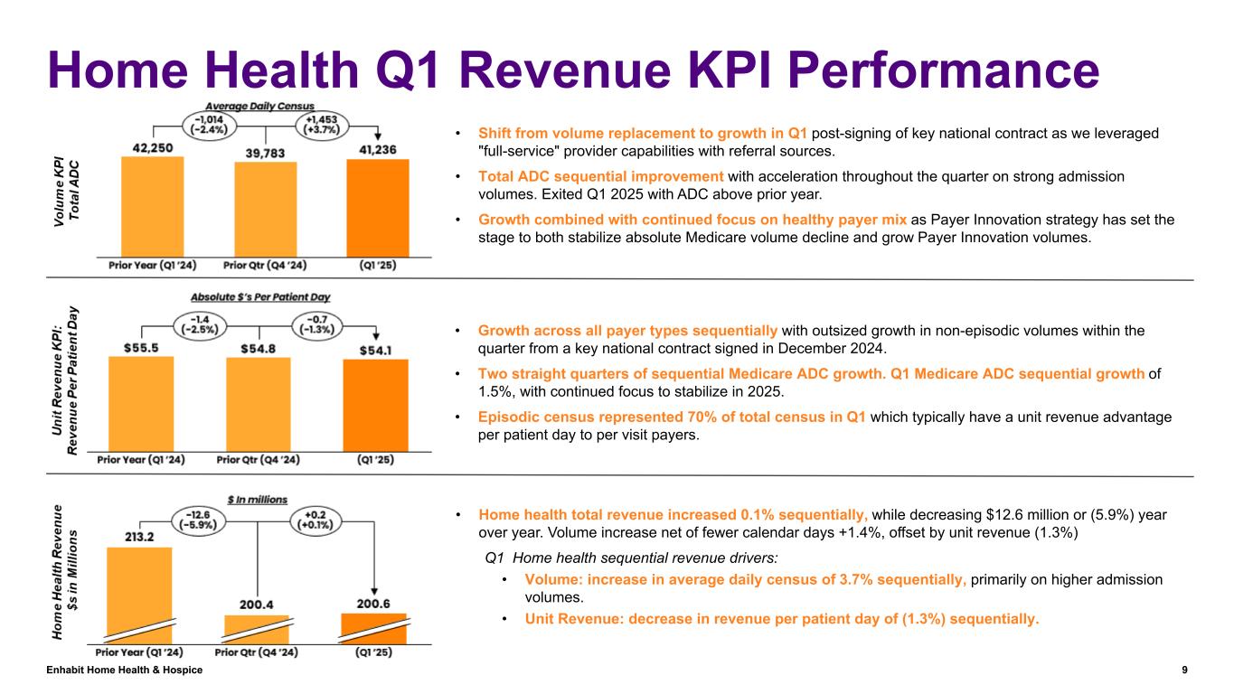 Enhabit Home Health & Hospice 8 Clinical Expertise and High-Quality Outcomes Enhabit National Average % Better Than Average QoPC Star Rating1 3.2 3.0 6.7% 70% of our home health agencies are 3 Stars or higher; 21% are 4 Stars or higher1 HHCAHPS Star Rating2 3.9 3.7 5.4% 99% of our home health agencies are 3 Stars or higher; 81% are 4 Stars or higher2 30-Day Hospital Readmission Rate3 13.7% 18.0% 23.9% % of patients readmitted to an acute care hospital within 30 days of start of care or resumption of care Patient Visits in Last Days of Life4 67.1% 47.4% 41.6% % of patients who received in person visits from RN or medical social worker on at least two out of the final three days of the patient’s life Standardized Protocols Motivated Clinicians Disciplined Use of Technology Superior Performance ü ü ü ü (1) Quality of Patient Care (QoPC) Star Ratings as of April 23, 2025 with claims data CY2023 and oasis-based data July 2023 through June 2024 (2) Home Health Care Consumer Assessment of Healthcare Providers (HHCAHPS) Patient Survey Star Ratings as of April 23, 2025 for dates of service October 2023 through September 2024 (3) Research Institute for Home Care 2024 Chartbook (data from Medicare Standard Analytics Files for CY 2023), Enhabit data is as of Q1 2025 (4) Medicare fee for service claims data from January 1, 2022 to December 31, 2023 (source Medicare Provider Data catalog - February 2025)