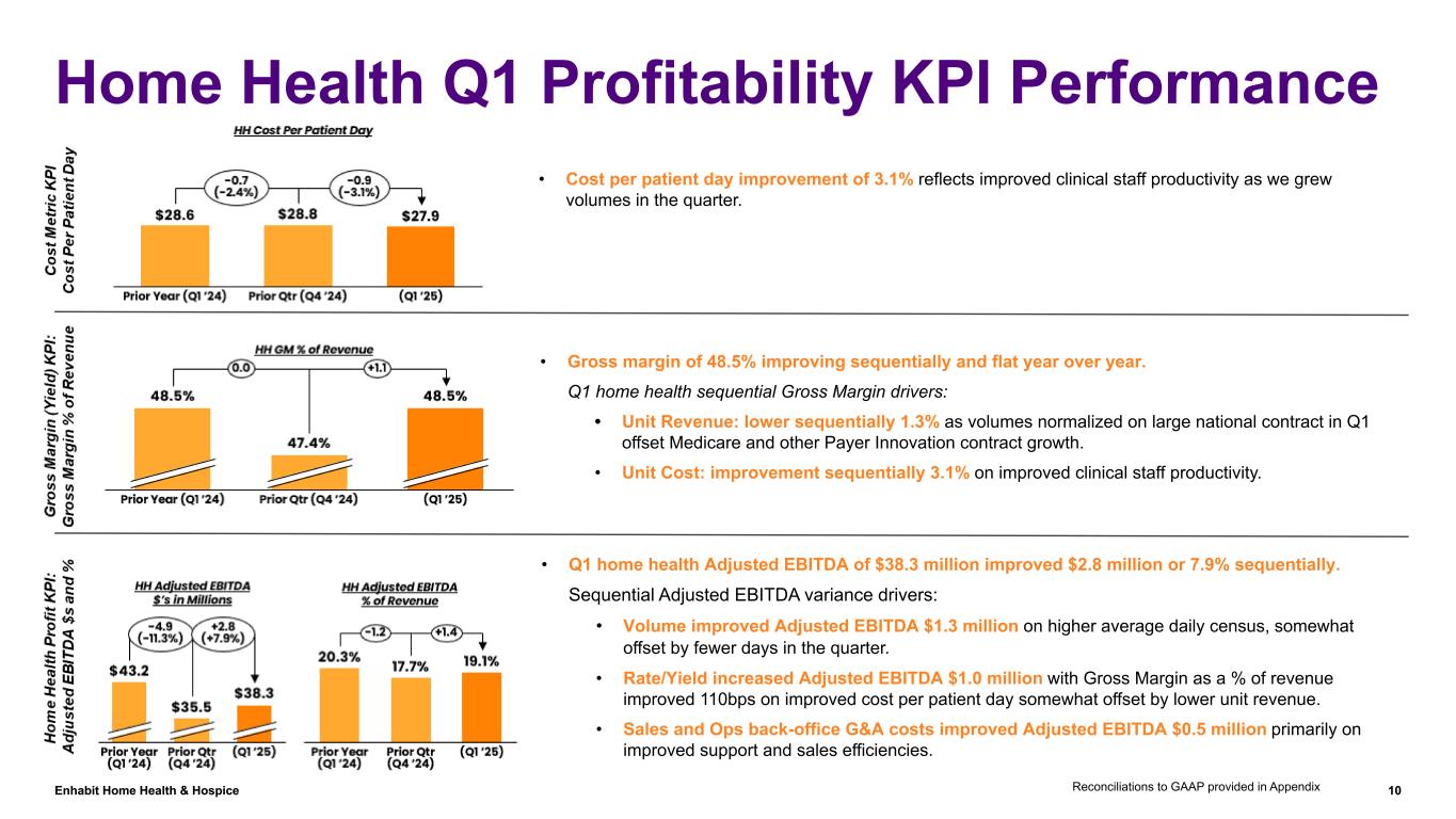 Enhabit Home Health & Hospice 9 Home Health Q1 Revenue KPI Performance • Growth across all payer types sequentially with outsized growth in non-episodic volumes within the quarter from a key national contract signed in December 2024. • Two straight quarters of sequential Medicare ADC growth. Q1 Medicare ADC sequential growth of 1.5%, with continued focus to stabilize in 2025. • Episodic census represented 70% of total census in Q1 which typically have a unit revenue advantage per patient day to per visit payers. • Home health total revenue increased 0.1% sequentially, while decreasing $12.6 million or (5.9%) year over year. Volume increase net of fewer calendar days +1.4%, offset by unit revenue (1.3%) Q1 Home health sequential revenue drivers: • Volume: increase in average daily census of 3.7% sequentially, primarily on higher admission volumes. • Unit Revenue: decrease in revenue per patient day of (1.3%) sequentially. • Shift from volume replacement to growth in Q1 post-signing of key national contract as we leveraged "full-service" provider capabilities with referral sources. • Total ADC sequential improvement with acceleration throughout the quarter on strong admission volumes. Exited Q1 2025 with ADC above prior year. • Growth combined with continued focus on healthy payer mix as Payer Innovation strategy has set the stage to both stabilize absolute Medicare volume decline and grow Payer Innovation volumes.