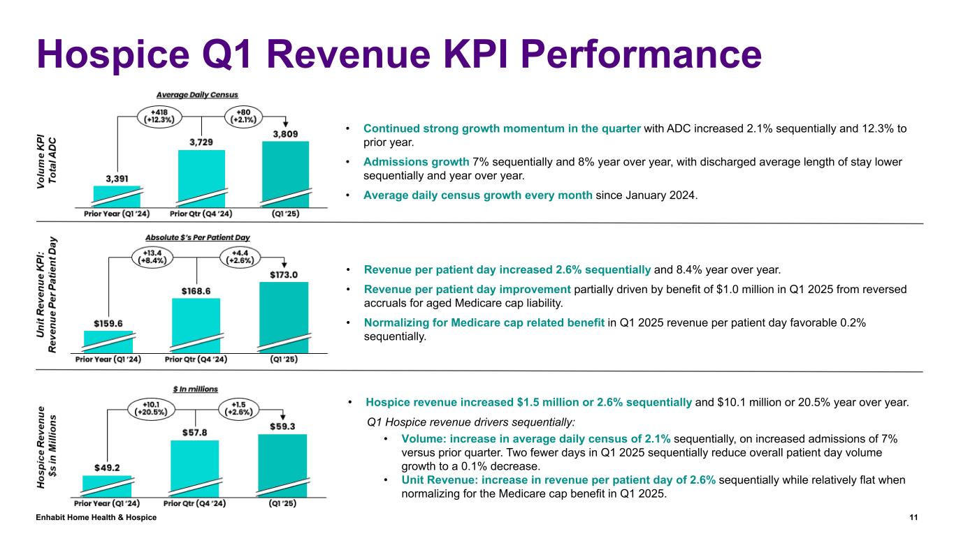Enhabit Home Health & Hospice 10 Home Health Q1 Profitability KPI Performance • Gross margin of 48.5% improving sequentially and flat year over year. Q1 home health sequential Gross Margin drivers: • Unit Revenue: lower sequentially 1.3% as volumes normalized on large national contract in Q1 offset Medicare and other Payer Innovation contract growth. • Unit Cost: improvement sequentially 3.1% on improved clinical staff productivity. Reconciliations to GAAP provided in Appendix • Q1 home health Adjusted EBITDA of $38.3 million improved $2.8 million or 7.9% sequentially. Sequential Adjusted EBITDA variance drivers: • Volume improved Adjusted EBITDA $1.3 million on higher average daily census, somewhat offset by fewer days in the quarter. • Rate/Yield increased Adjusted EBITDA $1.0 million with Gross Margin as a % of revenue improved 110bps on improved cost per patient day somewhat offset by lower unit revenue. • Sales and Ops back-office G&A costs improved Adjusted EBITDA $0.5 million primarily on improved support and sales efficiencies. • Cost per patient day improvement of 3.1% reflects improved clinical staff productivity as we grew volumes in the quarter.