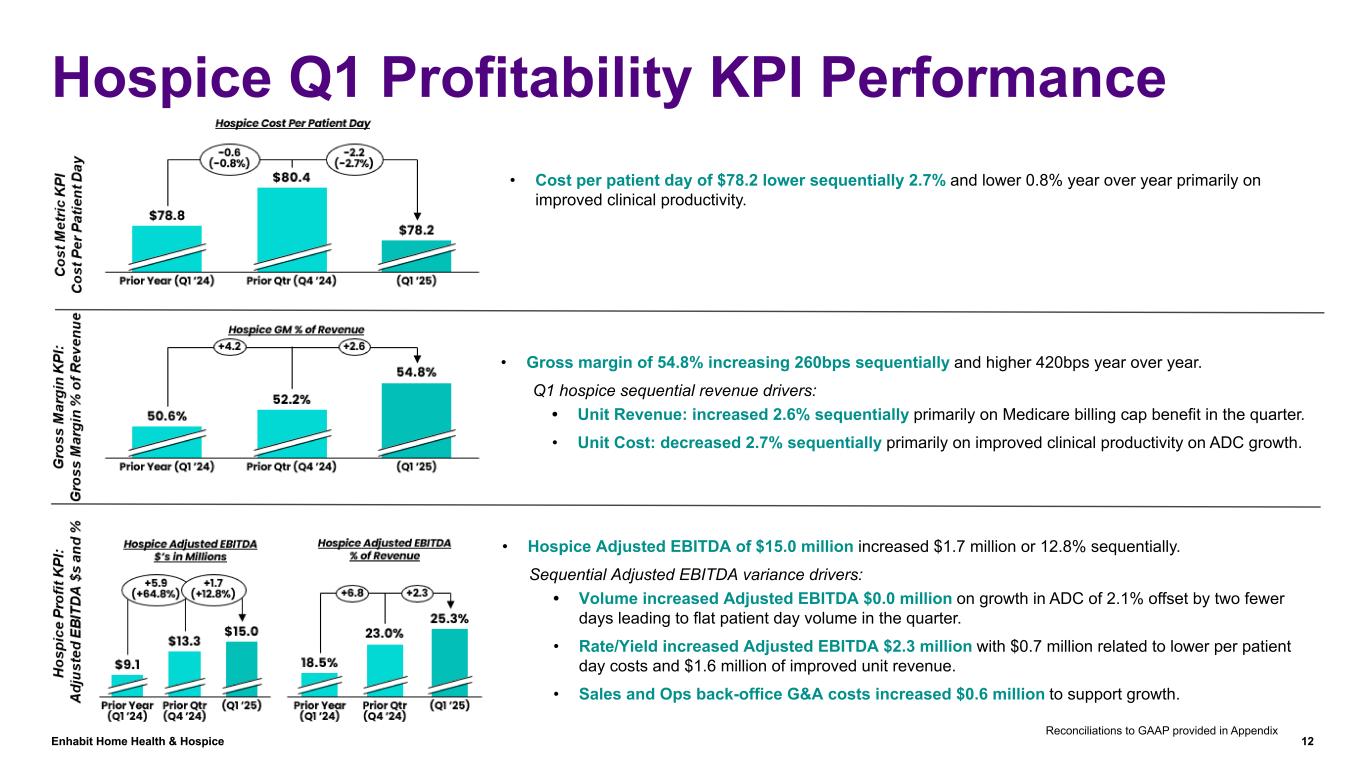 Enhabit Home Health & Hospice 11 Hospice Q1 Revenue KPI Performance • Revenue per patient day increased 2.6% sequentially and 8.4% year over year. • Revenue per patient day improvement partially driven by benefit of $1.0 million in Q1 2025 from reversed accruals for aged Medicare cap liability. • Normalizing for Medicare cap related benefit in Q1 2025 revenue per patient day favorable 0.2% sequentially. • Continued strong growth momentum in the quarter with ADC increased 2.1% sequentially and 12.3% to prior year. • Admissions growth 7% sequentially and 8% year over year, with discharged average length of stay lower sequentially and year over year. • Average daily census growth every month since January 2024. • Hospice revenue increased $1.5 million or 2.6% sequentially and $10.1 million or 20.5% year over year. Q1 Hospice revenue drivers sequentially: • Volume: increase in average daily census of 2.1% sequentially, on increased admissions of 7% versus prior quarter. Two fewer days in Q1 2025 sequentially reduce overall patient day volume growth to a 0.1% decrease. • Unit Revenue: increase in revenue per patient day of 2.6% sequentially while relatively flat when normalizing for the Medicare cap benefit in Q1 2025.