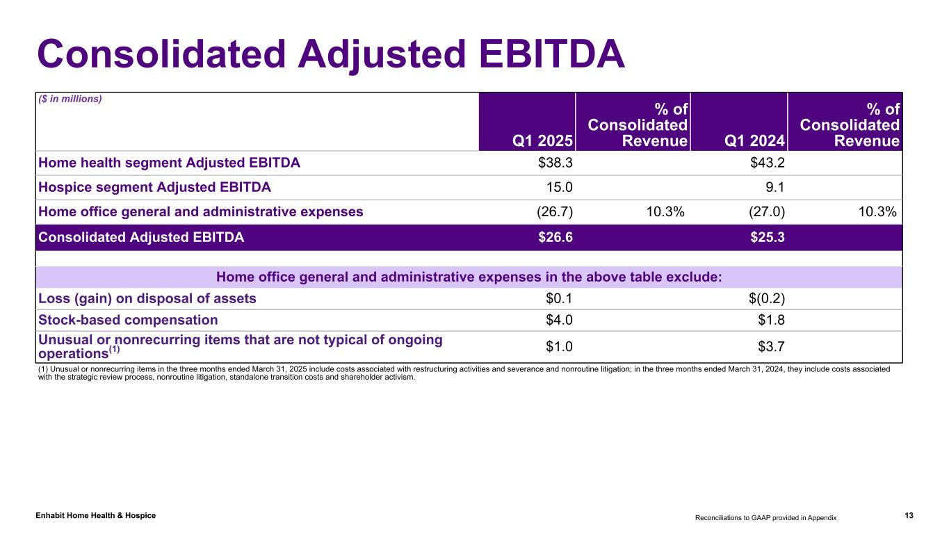 Enhabit Home Health & Hospice 12 Hospice Q1 Profitability KPI Performance • Gross margin of 54.8% increasing 260bps sequentially and higher 420bps year over year. Q1 hospice sequential revenue drivers: • Unit Revenue: increased 2.6% sequentially primarily on Medicare billing cap benefit in the quarter. • Unit Cost: decreased 2.7% sequentially primarily on improved clinical productivity on ADC growth. • Hospice Adjusted EBITDA of $15.0 million increased $1.7 million or 12.8% sequentially. Sequential Adjusted EBITDA variance drivers: • Volume increased Adjusted EBITDA $0.0 million on growth in ADC of 2.1% offset by two fewer days leading to flat patient day volume in the quarter. • Rate/Yield increased Adjusted EBITDA $2.3 million with $0.7 million related to lower per patient day costs and $1.6 million of improved unit revenue. • Sales and Ops back-office G&A costs increased $0.6 million to support growth. • Cost per patient day of $78.2 lower sequentially 2.7% and lower 0.8% year over year primarily on improved clinical productivity. Reconciliations to GAAP provided in Appendix