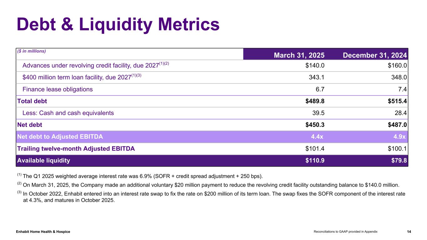 Enhabit Home Health & Hospice 13 Consolidated Adjusted EBITDA ($ in millions) Q1 2025 % of Consolidated Revenue Q1 2024 % of Consolidated Revenue Home health segment Adjusted EBITDA $38.3 $43.2 Hospice segment Adjusted EBITDA 15.0 9.1 Home office general and administrative expenses (26.7) 10.3% (27.0) 10.3% Consolidated Adjusted EBITDA $26.6 $25.3 Home office general and administrative expenses in the above table exclude: Loss (gain) on disposal of assets $0.1 $(0.2) Stock-based compensation $4.0 $1.8 Unusual or nonrecurring items that are not typical of ongoing operations(1) $1.0 $3.7 (1) Unusual or nonrecurring items in the three months ended March 31, 2025 include costs associated with restructuring activities and severance and nonroutine litigation; in the three months ended March 31, 2024, they include costs associated with the strategic review process, nonroutine litigation, standalone transition costs and shareholder activism. Reconciliations to GAAP provided in Appendix