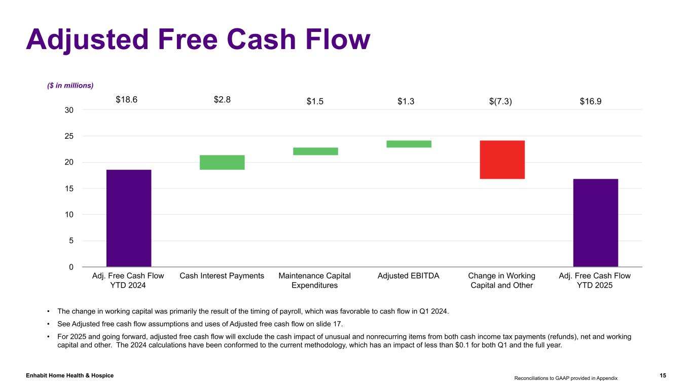 Enhabit Home Health & Hospice 14 Debt & Liquidity Metrics ($ in millions) March 31, 2025 December 31, 2024 Advances under revolving credit facility, due 2027(1)(2) $140.0 $160.0 $400 million term loan facility, due 2027(1)(3) 343.1 348.0 Finance lease obligations 6.7 7.4 Total debt $489.8 $515.4 Less: Cash and cash equivalents 39.5 28.4 Net debt $450.3 $487.0 Net debt to Adjusted EBITDA 4.4x 4.9x Trailing twelve-month Adjusted EBITDA $101.4 $100.1 Available liquidity $110.9 $79.8 (1) The Q1 2025 weighted average interest rate was 6.9% (SOFR + credit spread adjustment + 250 bps). (2) On March 31, 2025, the Company made an additional voluntary $20 million payment to reduce the revolving credit facility outstanding balance to $140.0 million. (3) In October 2022, Enhabit entered into an interest rate swap to fix the rate on $200 million of its term loan. The swap fixes the SOFR component of the interest rate at 4.3%, and matures in October 2025. Reconciliations to GAAP provided in Appendix