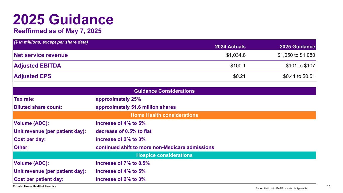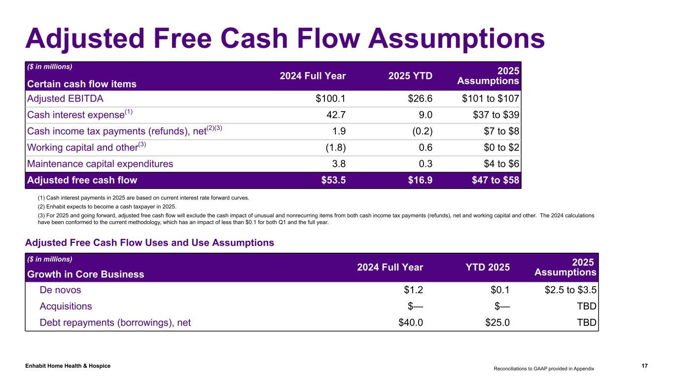 Enhabit Home Health & Hospice 16 2025 Guidance ($ in millions, except per share data) 2024 Actuals 2025 Guidance Net service revenue $1,034.8 $1,050 to $1,080 Adjusted EBITDA $100.1 $101 to $107 Adjusted EPS $0.21 $0.41 to $0.51 Guidance Considerations Tax rate: approximately 25% Diluted share count: approximately 51.6 million shares Home Health considerations Volume (ADC): increase of 4% to 5% Unit revenue (per patient day): decrease of 0.5% to flat Cost per day: increase of 2% to 3% Other: continued shift to more non-Medicare admissions Hospice considerations Volume (ADC): increase of 7% to 8.5% Unit revenue (per patient day): increase of 4% to 5% Cost per patient day: increase of 2% to 3% Reconciliations to GAAP provided in Appendix Reaffirmed as of May 7, 2025