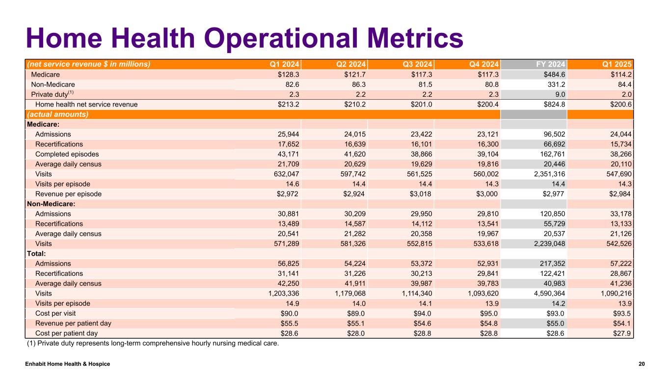 Enhabit Home Health & Hospice 19 Home Health Segment ($ in millions) Q1 '25 vs. '242025 2024 Net service revenue: Medicare $114.2 $128.3 (11.0) % Non-Medicare 84.4 82.6 2.2 % Private duty(1) 2.0 2.3 (13.0) % Home health net service revenue 200.6 213.2 (5.9) % Cost of service 103.4 109.9 (5.9) % Gross margin 48.5 % 48.5 % General and administrative expenses 58.4 59.5 (1.8) % Net income attributable to noncontrolling interests 0.5 0.6 (16.7) % Adjusted EBITDA $38.3 $43.2 (11.3) % % Adj. EBITDA margin 19.1 % 20.3 % Operational metrics (actual amounts) Medicare: Admissions 24,044 25,944 (7.3) % Recertifications 15,734 17,652 (10.9) % Completed episodes 38,266 43,171 (11.4) % Average daily census 20,110 21,709 (7.4) % Visits 547,690 632,047 (13.3) % Visits per episode 14.3 14.6 (2.1) % Revenue per episode $2,984 $2,972 0.4 % Non-Medicare: Admissions 33,178 30,881 7.4 % Recertifications 13,133 13,489 (2.6) % Average daily census 21,126 20,541 2.8 % Visits 542,526 571,289 (5.0) % Total: Admissions 57,222 56,825 0.7 % Same-store total admissions growth 0.7 % Recertifications 28,867 31,141 (7.3) % Same-store total recertifications growth (7.3) % Average daily census 41,236 42,250 (2.4) % Visits 1,090,216 1,203,336 (9.4) % Visits per episode 13.9 14.9 (6.7) % Cost per visit $93.5 $90.0 3.9 % Revenue per patient day $54.1 $55.5 (2.5) % Cost per patient day $27.9 $28.6 (2.4) % (1) Private duty represents long-term comprehensive hourly nursing medical care. Reconciliations to GAAP provided in Appendix