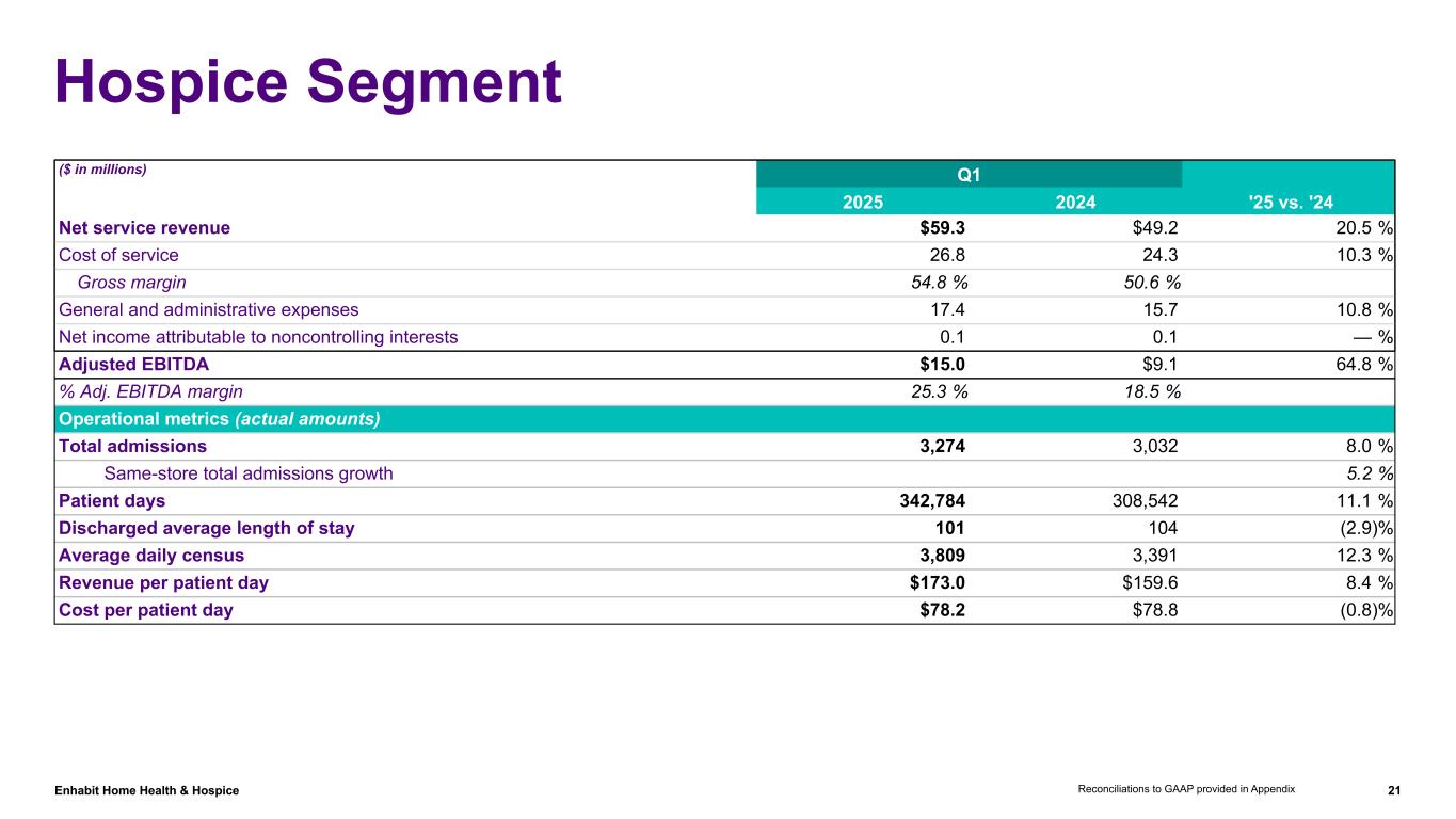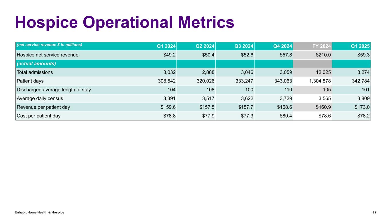 Enhabit Home Health & Hospice 20 Home Health Operational Metrics (net service revenue $ in millions) Q1 2024 Q2 2024 Q3 2024 Q4 2024 FY 2024 Q1 2025 Medicare $128.3 $121.7 $117.3 $117.3 $484.6 $114.2 Non-Medicare 82.6 86.3 81.5 80.8 331.2 84.4 Private duty(1) 2.3 2.2 2.2 2.3 9.0 2.0 Home health net service revenue $213.2 $210.2 $201.0 $200.4 $824.8 $200.6 (actual amounts) Medicare: Admissions 25,944 24,015 23,422 23,121 96,502 24,044 Recertifications 17,652 16,639 16,101 16,300 66,692 15,734 Completed episodes 43,171 41,620 38,866 39,104 162,761 38,266 Average daily census 21,709 20,629 19,629 19,816 20,446 20,110 Visits 632,047 597,742 561,525 560,002 2,351,316 547,690 Visits per episode 14.6 14.4 14.4 14.3 14.4 14.3 Revenue per episode $2,972 $2,924 $3,018 $3,000 $2,977 $2,984 Non-Medicare: Admissions 30,881 30,209 29,950 29,810 120,850 33,178 Recertifications 13,489 14,587 14,112 13,541 55,729 13,133 Average daily census 20,541 21,282 20,358 19,967 20,537 21,126 Visits 571,289 581,326 552,815 533,618 2,239,048 542,526 Total: Admissions 56,825 54,224 53,372 52,931 217,352 57,222 Recertifications 31,141 31,226 30,213 29,841 122,421 28,867 Average daily census 42,250 41,911 39,987 39,783 40,983 41,236 Visits 1,203,336 1,179,068 1,114,340 1,093,620 4,590,364 1,090,216 Visits per episode 14.9 14.0 14.1 13.9 14.2 13.9 Cost per visit $90.0 $89.0 $94.0 $95.0 $93.0 $93.5 Revenue per patient day $55.5 $55.1 $54.6 $54.8 $55.0 $54.1 Cost per patient day $28.6 $28.0 $28.8 $28.8 $28.6 $27.9 (1) Private duty represents long-term comprehensive hourly nursing medical care.