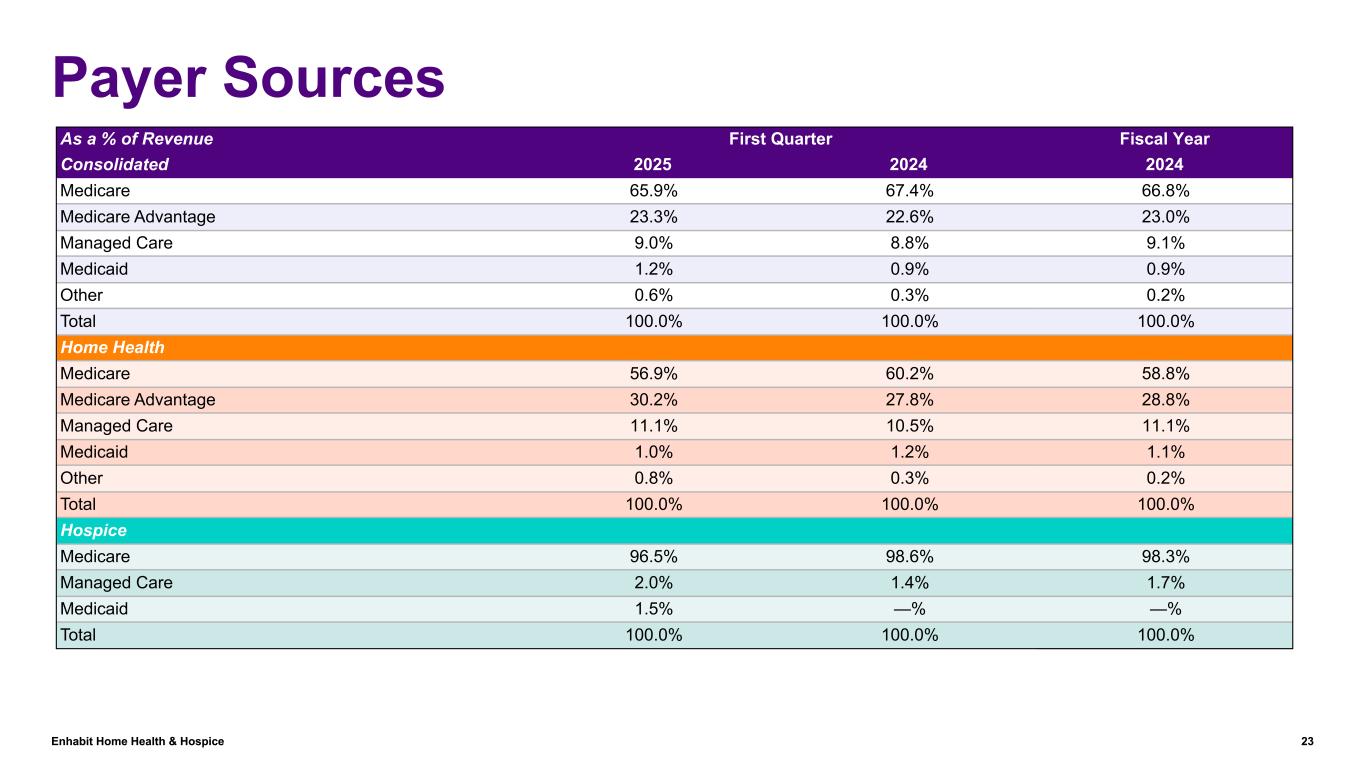Enhabit Home Health & Hospice 23 Payer Sources As a % of Revenue First Quarter Fiscal Year Consolidated 2025 2024 2024 Medicare 65.9% 67.4% 66.8% Medicare Advantage 23.3% 22.6% 23.0% Managed Care 9.0% 8.8% 9.1% Medicaid 1.2% 0.9% 0.9% Other 0.6% 0.3% 0.2% Total 100.0% 100.0% 100.0% Home Health Medicare 56.9% 60.2% 58.8% Medicare Advantage 30.2% 27.8% 28.8% Managed Care 11.1% 10.5% 11.1% Medicaid 1.0% 1.2% 1.1% Other 0.8% 0.3% 0.2% Total 100.0% 100.0% 100.0% Hospice Medicare 96.5% 98.6% 98.3% Managed Care 2.0% 1.4% 1.7% Medicaid 1.5% —% —% Total 100.0% 100.0% 100.0%
