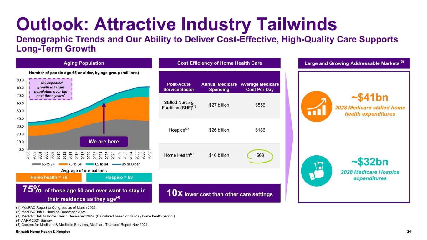 Enhabit Home Health & Hospice 24 (1) MedPAC Report to Congress as of March 2023. (2) MedPAC Tab H Hospice December 2024 (3) MedPAC Tab G Home Health December 2024. (Calculated based on 30-day home health period.) (4) AARP 2024 Survey. (5) Centers for Medicare & Medicaid Services, Medicare Trustees’ Report Nov 2021. Aging Population Cost Efficiency of Home Health Care Large and Growing Addressable Markets(5) Large and Growing Addressable Markets4 ~$41bn 2028 Medicare skilled home health expenditures ~$32bn 2028 Medicare Hospice expenditures 75% of those age 50 and over want to stay in their residence as they age(4) 10x lower cost than other care settings Post-Acute Service Sector Annual Medicare Spending Average Medicare Cost Per Day Skilled Nursing Facilities (SNF)(1) $27 billion $556 Hospice(2) $26 billion $186 Home Health(3) $16 billion $63 Home health = 76 Hospice = 83 Number of people age 65 or older, by age group (millions) ~5% expected growth in target population over the next three years3 We are here Avg. age of our patients Outlook: Attractive Industry Tailwinds Demographic Trends and Our Ability to Deliver Cost-Effective, High-Quality Care Supports Long-Term Growth