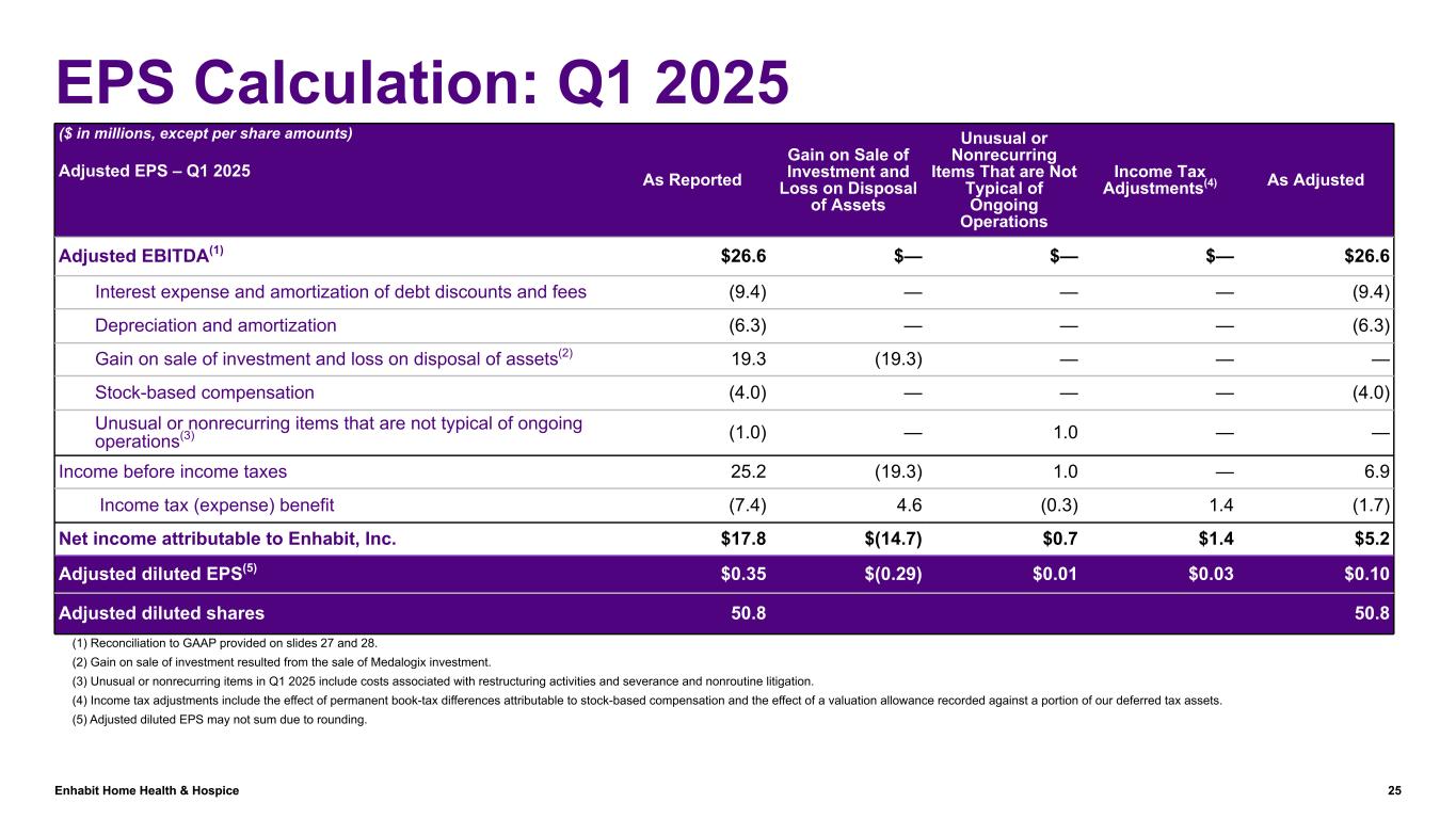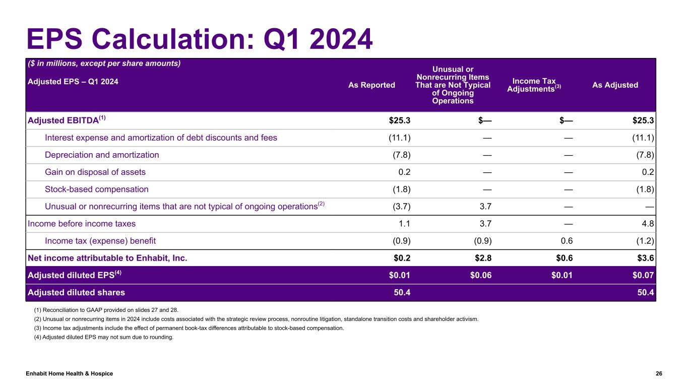 Enhabit Home Health & Hospice 25 EPS Calculation: Q1 2025 ($ in millions, except per share amounts) Adjusted EPS – Q1 2025 As Reported Gain on Sale of Investment and Loss on Disposal of Assets Unusual or Nonrecurring Items That are Not Typical of Ongoing Operations Income Tax Adjustments(4) As Adjusted Adjusted EBITDA(1) $26.6 $— $— $— $26.6 Interest expense and amortization of debt discounts and fees (9.4) — — — (9.4) Depreciation and amortization (6.3) — — — (6.3) Gain on sale of investment and loss on disposal of assets(2) 19.3 (19.3) — — — Stock-based compensation (4.0) — — — (4.0) Unusual or nonrecurring items that are not typical of ongoing operations(3) (1.0) — 1.0 — — Income before income taxes 25.2 (19.3) 1.0 — 6.9 Income tax (expense) benefit (7.4) 4.6 (0.3) 1.4 (1.7) Net income attributable to Enhabit, Inc. $17.8 $(14.7) $0.7 $1.4 $5.2 Adjusted diluted EPS(5) $0.35 $(0.29) $0.01 $0.03 $0.10 Adjusted diluted shares 50.8 50.8 (1) Reconciliation to GAAP provided on slides 27 and 28. (2) Gain on sale of investment resulted from the sale of Medalogix investment. (3) Unusual or nonrecurring items in Q1 2025 include costs associated with restructuring activities and severance and nonroutine litigation. (4) Income tax adjustments include the effect of permanent book-tax differences attributable to stock-based compensation and the effect of a valuation allowance recorded against a portion of our deferred tax assets. (5) Adjusted diluted EPS may not sum due to rounding.