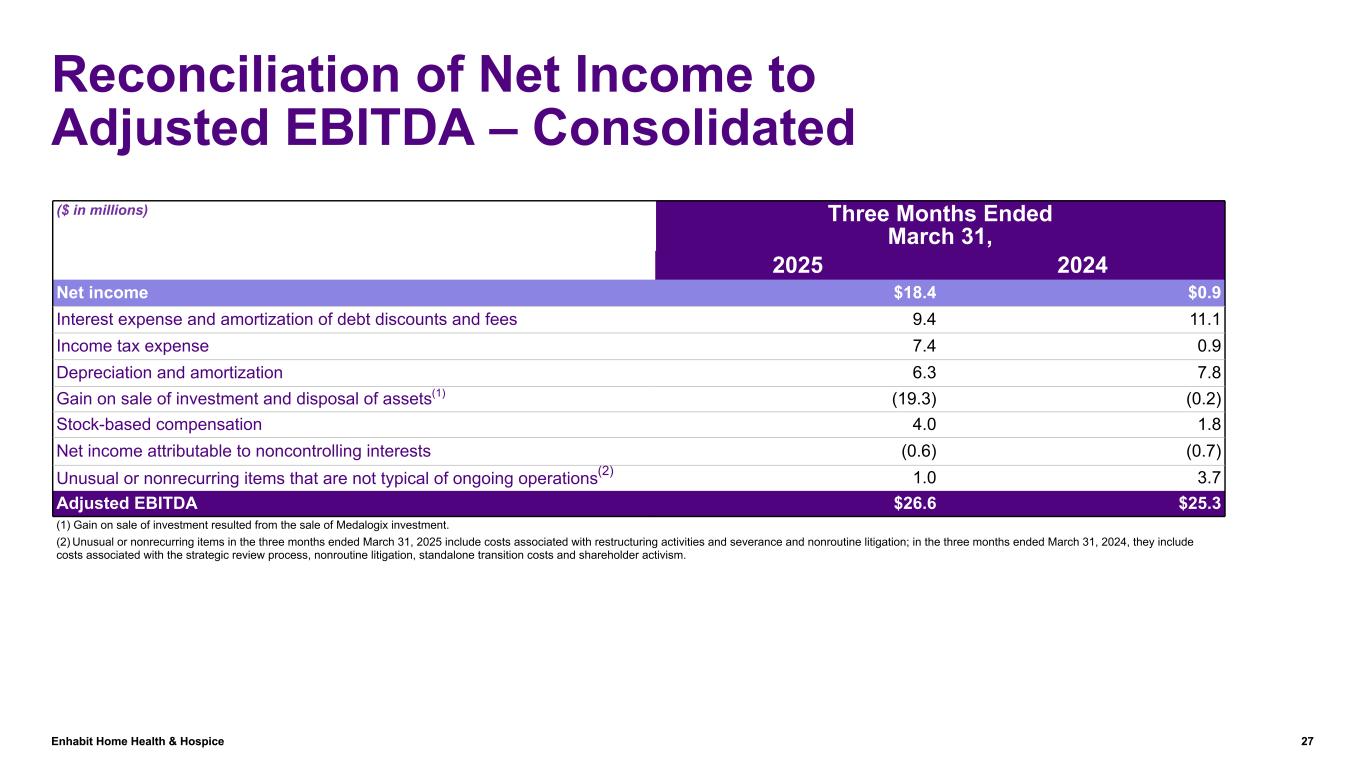 Enhabit Home Health & Hospice 27 Reconciliation of Net Income to Adjusted EBITDA – Consolidated ($ in millions) Three Months Ended March 31, 2025 2024 Net income $18.4 $0.9 Interest expense and amortization of debt discounts and fees 9.4 11.1 Income tax expense 7.4 0.9 Depreciation and amortization 6.3 7.8 Gain on sale of investment and disposal of assets(1) (19.3) (0.2) Stock-based compensation 4.0 1.8 Net income attributable to noncontrolling interests (0.6) (0.7) Unusual or nonrecurring items that are not typical of ongoing operations(2) 1.0 3.7 Adjusted EBITDA $26.6 $25.3 (1) Gain on sale of investment resulted from the sale of Medalogix investment. (2) Unusual or nonrecurring items in the three months ended March 31, 2025 include costs associated with restructuring activities and severance and nonroutine litigation; in the three months ended March 31, 2024, they include costs associated with the strategic review process, nonroutine litigation, standalone transition costs and shareholder activism.