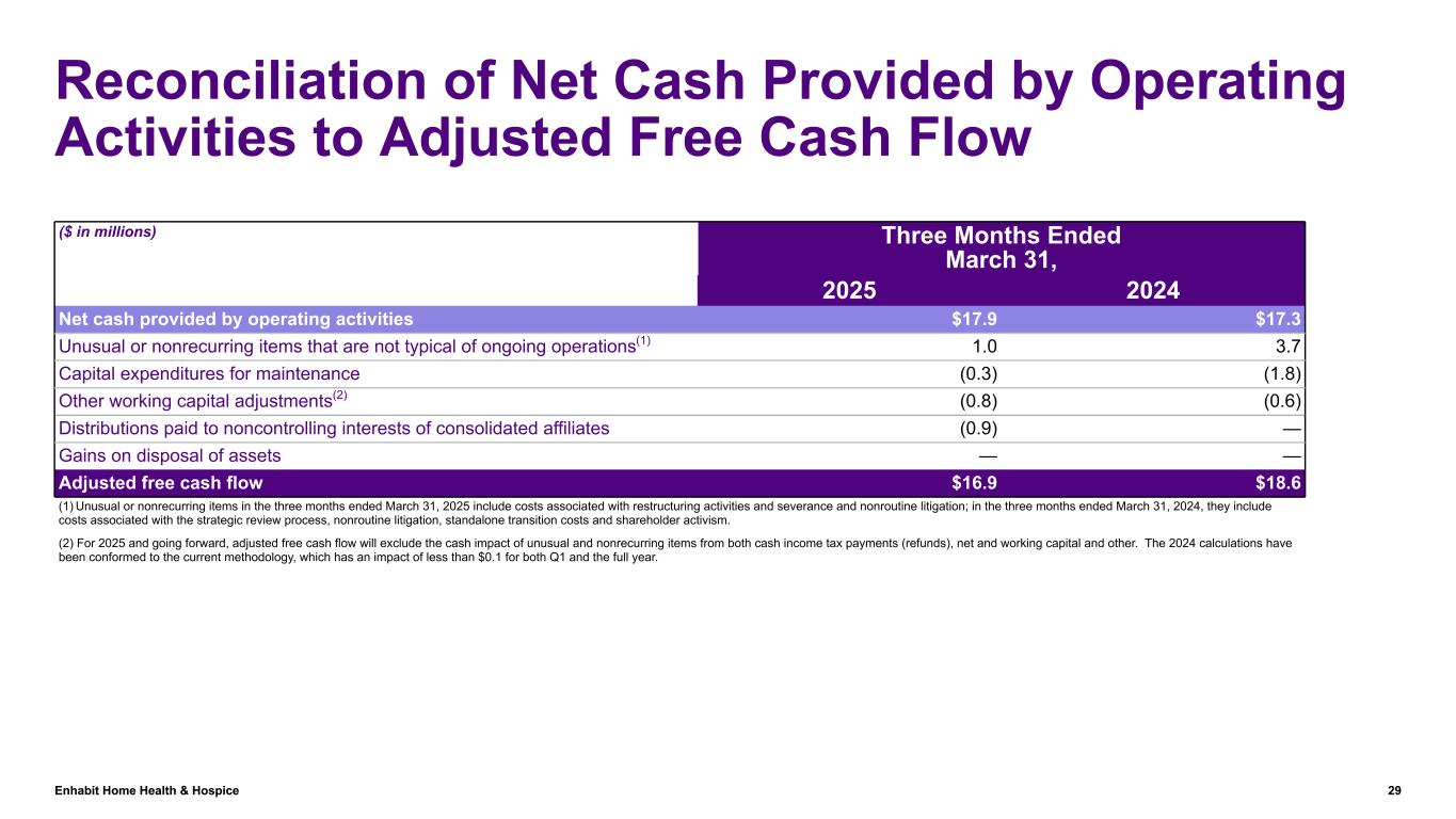Enhabit Home Health & Hospice 28 Reconciliation of Net Cash Provided by Operating Activities to Adjusted EBITDA ($ in millions) Three Months Ended March 31, 2025 2024 Net cash provided by operating activities $17.9 $17.3 Interest expense, excluding amortization of debt discounts and fees 9.0 10.7 Current portion of income tax expense 6.2 1.4 Change in assets and liabilities (6.9) (7.2) Net income attributable to noncontrolling interests (0.6) (0.7) Unusual or nonrecurring items that are not typical of ongoing operations(1) 1.0 3.7 Other — 0.1 Adjusted EBITDA $26.6 $25.3 (1) Unusual or nonrecurring items in the three months ended March 31, 2025 include costs associated with restructuring activities and severance and nonroutine litigation; in the three months ended March 31, 2024, they include costs associated with the strategic review process, nonroutine litigation, standalone transition costs and shareholder activism.