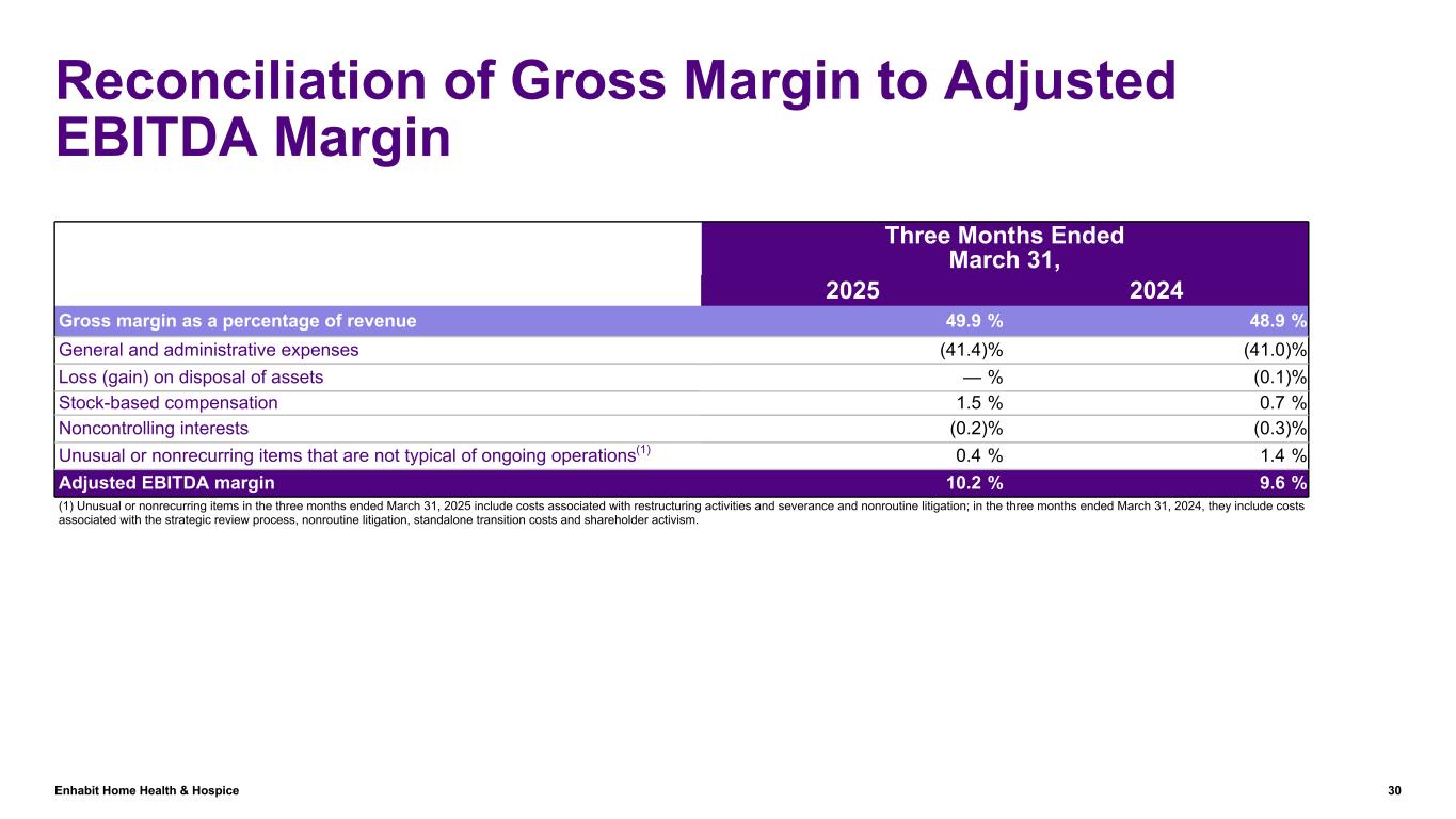 Enhabit Home Health & Hospice 29 Reconciliation of Net Cash Provided by Operating Activities to Adjusted Free Cash Flow ($ in millions) Three Months Ended March 31, 2025 2024 Net cash provided by operating activities $17.9 $17.3 Unusual or nonrecurring items that are not typical of ongoing operations(1) 1.0 3.7 Capital expenditures for maintenance (0.3) (1.8) Other working capital adjustments(2) (0.8) (0.6) Distributions paid to noncontrolling interests of consolidated affiliates (0.9) — Gains on disposal of assets — — Adjusted free cash flow $16.9 $18.6 (1) Unusual or nonrecurring items in the three months ended March 31, 2025 include costs associated with restructuring activities and severance and nonroutine litigation; in the three months ended March 31, 2024, they include costs associated with the strategic review process, nonroutine litigation, standalone transition costs and shareholder activism. (2) For 2025 and going forward, adjusted free cash flow will exclude the cash impact of unusual and nonrecurring items from both cash income tax payments (refunds), net and working capital and other. The 2024 calculations have been conformed to the current methodology, which has an impact of less than $0.1 for both Q1 and the full year.
