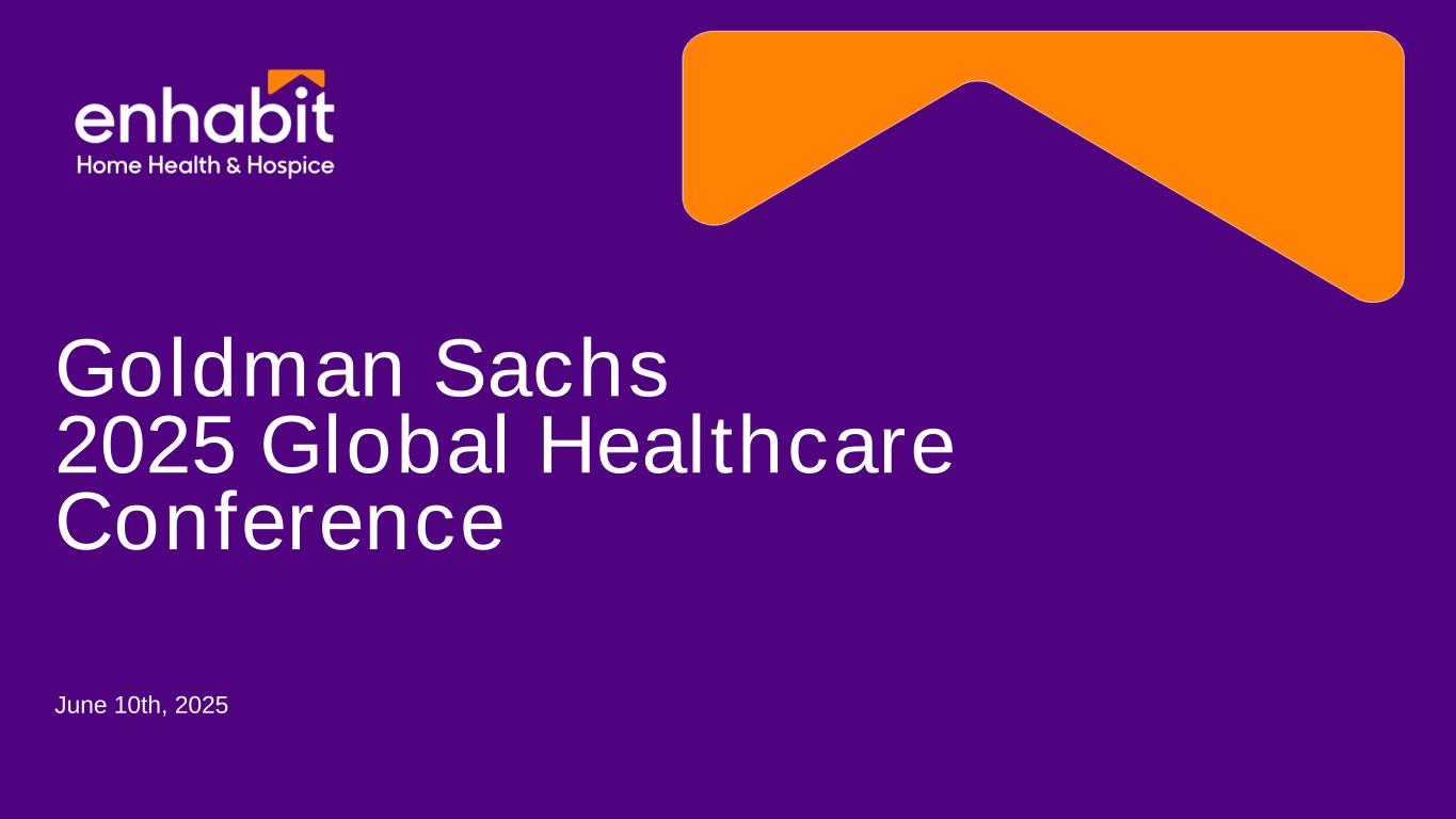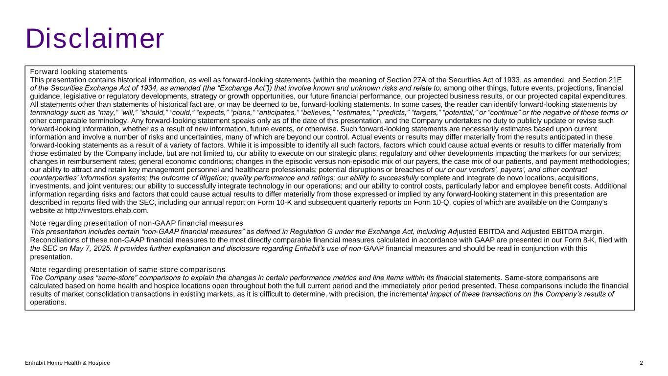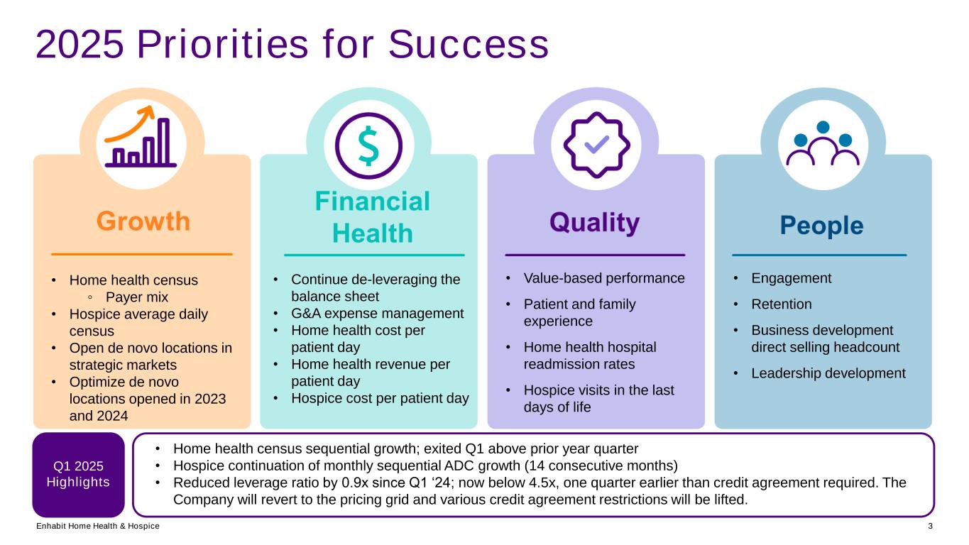 Enhabit Home Health & Hospice 2 Disclaimer Forward looking statements This presentation contains historical information, as well as forward-looking statements (within the meaning of Section 27A of the Securities Act of 1933, as amended, and Section 21E of the Securities Exchange Act of 1934, as amended (the “Exchange Act”)) that involve known and unknown risks and relate to, among other things, future events, projections, financial guidance, legislative or regulatory developments, strategy or growth opportunities, our future financial performance, our projected business results, or our projected capital expenditures. All statements other than statements of historical fact are, or may be deemed to be, forward-looking statements. In some cases, the reader can identify forward-looking statements by terminology such as “may,” “will,” “should,” “could,” “expects,” “plans,” “anticipates,” “believes,” “estimates,” “predicts,” “targets,” “potential,” or “continue” or the negative of these terms or other comparable terminology. Any forward-looking statement speaks only as of the date of this presentation, and the Company undertakes no duty to publicly update or revise such forward-looking information, whether as a result of new information, future events, or otherwise. Such forward-looking statements are necessarily estimates based upon current information and involve a number of risks and uncertainties, many of which are beyond our control. Actual events or results may differ materially from the results anticipated in these forward-looking statements as a result of a variety of factors. While it is impossible to identify all such factors, factors which could cause actual events or results to differ materially from those estimated by the Company include, but are not limited to, our ability to execute on our strategic plans; regulatory and other developments impacting the markets for our services; changes in reimbursement rates; general economic conditions; changes in the episodic versus non-episodic mix of our payers, the case mix of our patients, and payment methodologies; our ability to attract and retain key management personnel and healthcare professionals; potential disruptions or breaches of our or our vendors’, payers’, and other contract counterparties’ information systems; the outcome of litigation; quality performance and ratings; our ability to successfully complete and integrate de novo locations, acquisitions, investments, and joint ventures; our ability to successfully integrate technology in our operations; and our ability to control costs, particularly labor and employee benefit costs. Additional information regarding risks and factors that could cause actual results to differ materially from those expressed or implied by any forward-looking statement in this presentation are described in reports filed with the SEC, including our annual report on Form 10-K and subsequent quarterly reports on Form 10-Q, copies of which are available on the Company's website at http://investors.ehab.com. Note regarding presentation of non-GAAP financial measures This presentation includes certain “non-GAAP financial measures” as defined in Regulation G under the Exchange Act, including Adjusted EBITDA and Adjusted EBITDA margin. Reconciliations of these non-GAAP financial measures to the most directly comparable financial measures calculated in accordance with GAAP are presented in our Form 8-K, filed with the SEC on May 7, 2025. It provides further explanation and disclosure regarding Enhabit’s use of non-GAAP financial measures and should be read in conjunction with this presentation. Note regarding presentation of same-store comparisons The Company uses “same-store” comparisons to explain the changes in certain performance metrics and line items within its financial statements. Same-store comparisons are calculated based on home health and hospice locations open throughout both the full current period and the immediately prior period presented. These comparisons include the financial results of market consolidation transactions in existing markets, as it is difficult to determine, with precision, the incremental impact of these transactions on the Company’s results of operations.