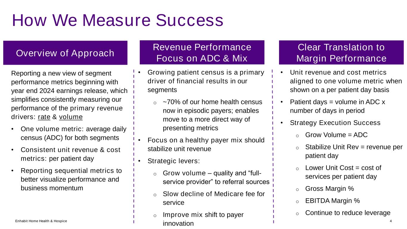 Enhabit Home Health & Hospice 3 2025 Priorities for Success • Home health census ◦ Payer mix • Hospice average daily census • Open de novo locations in strategic markets • Optimize de novo locations opened in 2023 and 2024 • Continue de-leveraging the balance sheet • G&A expense management • Home health cost per patient day • Home health revenue per patient day • Hospice cost per patient day • Value-based performance • Patient and family experience • Home health hospital readmission rates • Hospice visits in the last days of life • Engagement • Retention • Business development direct selling headcount • Leadership development • Home health census sequential growth; exited Q1 above prior year quarter • Hospice continuation of monthly sequential ADC growth (14 consecutive months) • Reduced leverage ratio by 0.9x since Q1 ‘24; now below 4.5x, one quarter earlier than credit agreement required. The Company will revert to the pricing grid and various credit agreement restrictions will be lifted. Q1 2025 Highlights