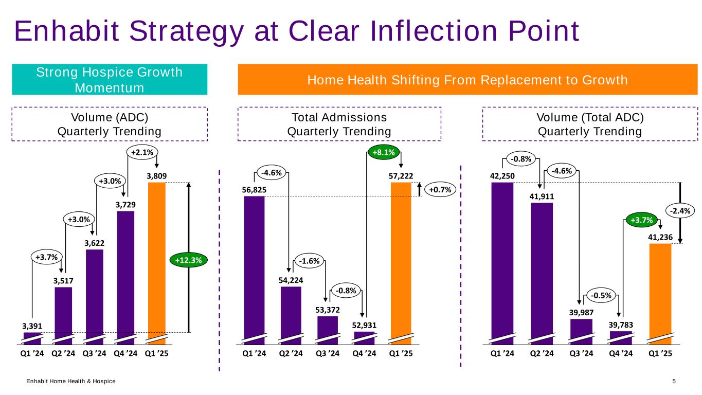 Enhabit Home Health & Hospice 4 How We Measure Success Reporting a new view of segment performance metrics beginning with year end 2024 earnings release, which simplifies consistently measuring our performance of the primary revenue drivers: rate & volume • One volume metric: average daily census (ADC) for both segments • Consistent unit revenue & cost metrics: per patient day • Reporting sequential metrics to better visualize performance and business momentum Overview of Approach • Growing patient census is a primary driver of financial results in our segments o ~70% of our home health census now in episodic payers; enables move to a more direct way of presenting metrics • Focus on a healthy payer mix should stabilize unit revenue • Strategic levers: o Grow volume – quality and “full- service provider” to referral sources o Slow decline of Medicare fee for service o Improve mix shift to payer innovation Revenue Performance Focus on ADC & Mix • Unit revenue and cost metrics aligned to one volume metric when shown on a per patient day basis • Patient days = volume in ADC x number of days in period • Strategy Execution Success o Grow Volume = ADC o Stabilize Unit Rev = revenue per patient day o Lower Unit Cost = cost of services per patient day o Gross Margin % o EBITDA Margin % o Continue to reduce leverage Clear Translation to Margin Performance