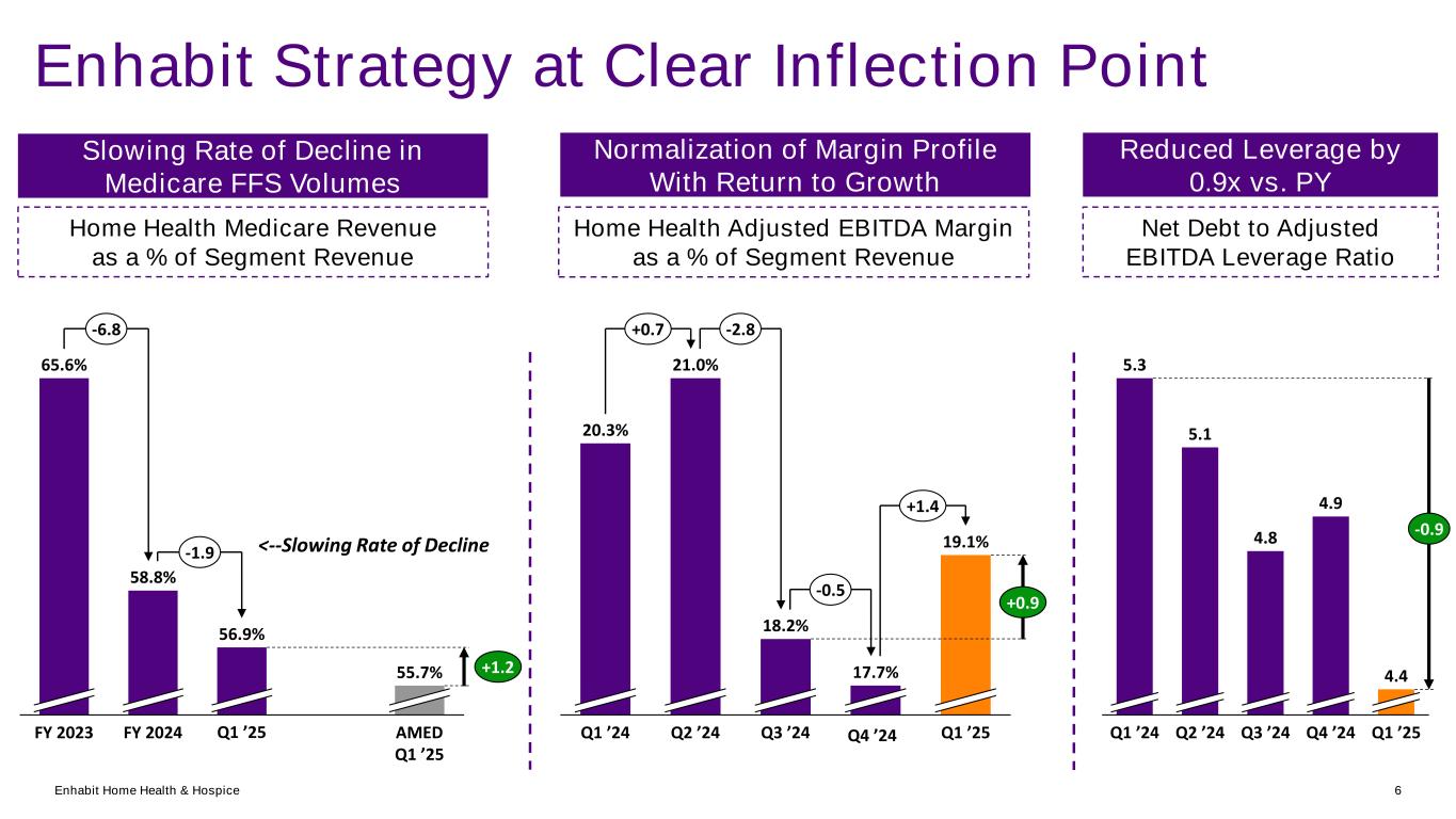 Enhabit Home Health & Hospice 5 Enhabit Strategy at Clear Inflection Point Strong Hospice Growth Momentum Q2 ’24Q1 ’24 Q1 ’25Q3 ’24 Q4 ’24 3,517 3,622 3,729 3,809 3,391 +12.3%+3.7% +3.0% +3.0% +2.1% Volume (ADC) Quarterly Trending Total Admissions Quarterly Trending Q1 ’25Q4 ’24Q3 ’24Q2 ’24 56,825 Q1 ’24 54,224 53,372 52,931 57,222 +0.7% -4.6% -1.6% -0.8% +8.1% Home Health Shifting From Replacement to Growth Volume (Total ADC) Quarterly Trending Q1 ’25Q4 ’24Q3 ’24Q2 ’24 42,250 41,911 Q1 ’24 39,987 39,783 41,236 -2.4% -0.8% -4.6% -0.5% +3.7%