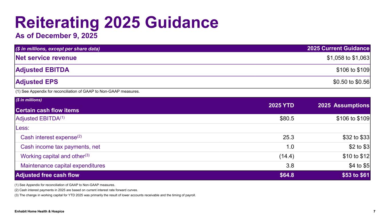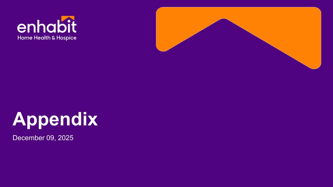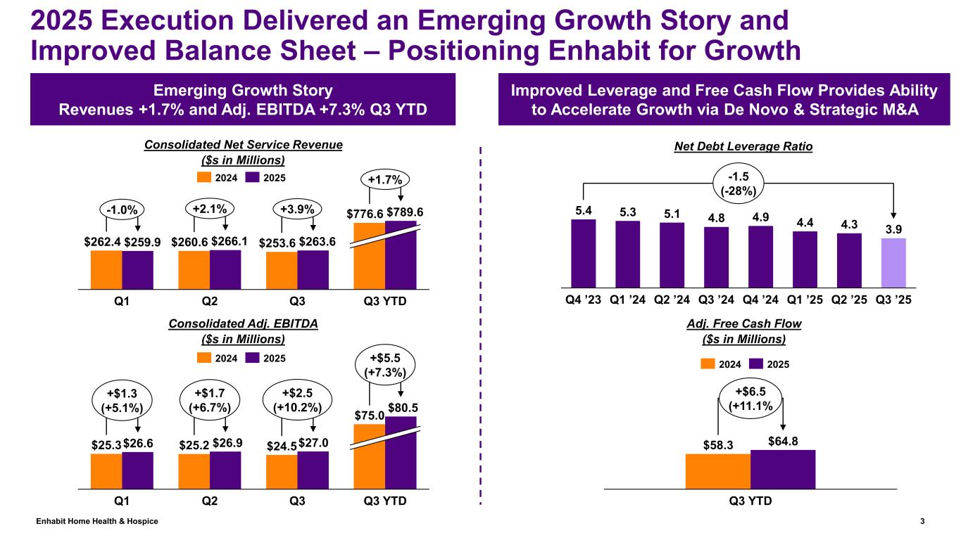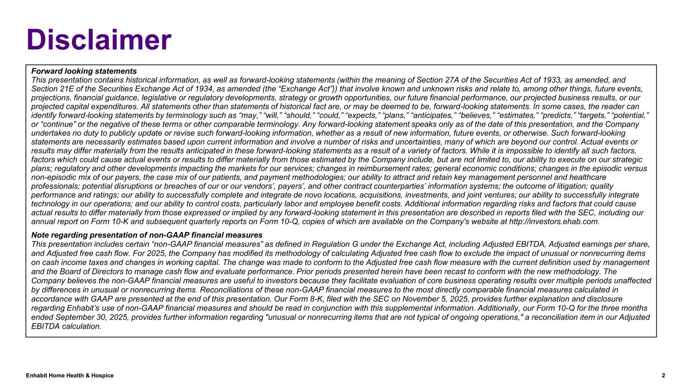 Enhabit Home Health & Hospice 2 Disclaimer Forward looking statements This presentation contains historical information, as well as forward-looking statements (within the meaning of Section 27A of the Securities Act of 1933, as amended, and Section 21E of the Securities Exchange Act of 1934, as amended (the “Exchange Act”)) that involve known and unknown risks and relate to, among other things, future events, projections, financial guidance, legislative or regulatory developments, strategy or growth opportunities, our future financial performance, our projected business results, or our projected capital expenditures. All statements other than statements of historical fact are, or may be deemed to be, forward-looking statements. In some cases, the reader can identify forward-looking statements by terminology such as “may,” “will,” “should,” “could,” “expects,” “plans,” “anticipates,” “believes,” “estimates,” “predicts,” “targets,” “potential,” or “continue” or the negative of these terms or other comparable terminology. Any forward-looking statement speaks only as of the date of this presentation, and the Company undertakes no duty to publicly update or revise such forward-looking information, whether as a result of new information, future events, or otherwise. Such forward-looking statements are necessarily estimates based upon current information and involve a number of risks and uncertainties, many of which are beyond our control. Actual events or results may differ materially from the results anticipated in these forward-looking statements as a result of a variety of factors. While it is impossible to identify all such factors, factors which could cause actual events or results to differ materially from those estimated by the Company include, but are not limited to, our ability to execute on our strategic plans; regulatory and other developments impacting the markets for our services; changes in reimbursement rates; general economic conditions; changes in the episodic versus non-episodic mix of our payers, the case mix of our patients, and payment methodologies; our ability to attract and retain key management personnel and healthcare professionals; potential disruptions or breaches of our or our vendors’, payers’, and other contract counterparties’ information systems; the outcome of litigation; quality performance and ratings; our ability to successfully complete and integrate de novo locations, acquisitions, investments, and joint ventures; our ability to successfully integrate technology in our operations; and our ability to control costs, particularly labor and employee benefit costs. Additional information regarding risks and factors that could cause actual results to differ materially from those expressed or implied by any forward-looking statement in this presentation are described in reports filed with the SEC, including our annual report on Form 10-K and subsequent quarterly reports on Form 10-Q, copies of which are available on the Company's website at http://investors.ehab.com. Note regarding presentation of non-GAAP financial measures This presentation includes certain “non-GAAP financial measures” as defined in Regulation G under the Exchange Act, including Adjusted EBITDA, Adjusted earnings per share, and Adjusted free cash flow. For 2025, the Company has modified its methodology of calculating Adjusted free cash flow to exclude the impact of unusual or nonrecurring items on cash income taxes and changes in working capital. The change was made to conform to the Adjusted free cash flow measure with the current definition used by management and the Board of Directors to manage cash flow and evaluate performance. Prior periods presented herein have been recast to conform with the new methodology. The Company believes the non-GAAP financial measures are useful to investors because they facilitate evaluation of core business operating results over multiple periods unaffected by differences in unusual or nonrecurring items. Reconciliations of these non-GAAP financial measures to the most directly comparable financial measures calculated in accordance with GAAP are presented at the end of this presentation. Our Form 8-K, filed with the SEC on November 5, 2025, provides further explanation and disclosure regarding Enhabit’s use of non-GAAP financial measures and should be read in conjunction with this supplemental information. Additionally, our Form 10-Q for the three months ended September 30, 2025, provides further information regarding "unusual or nonrecurring items that are not typical of ongoing operations," a reconciliation item in our Adjusted EBITDA calculation.