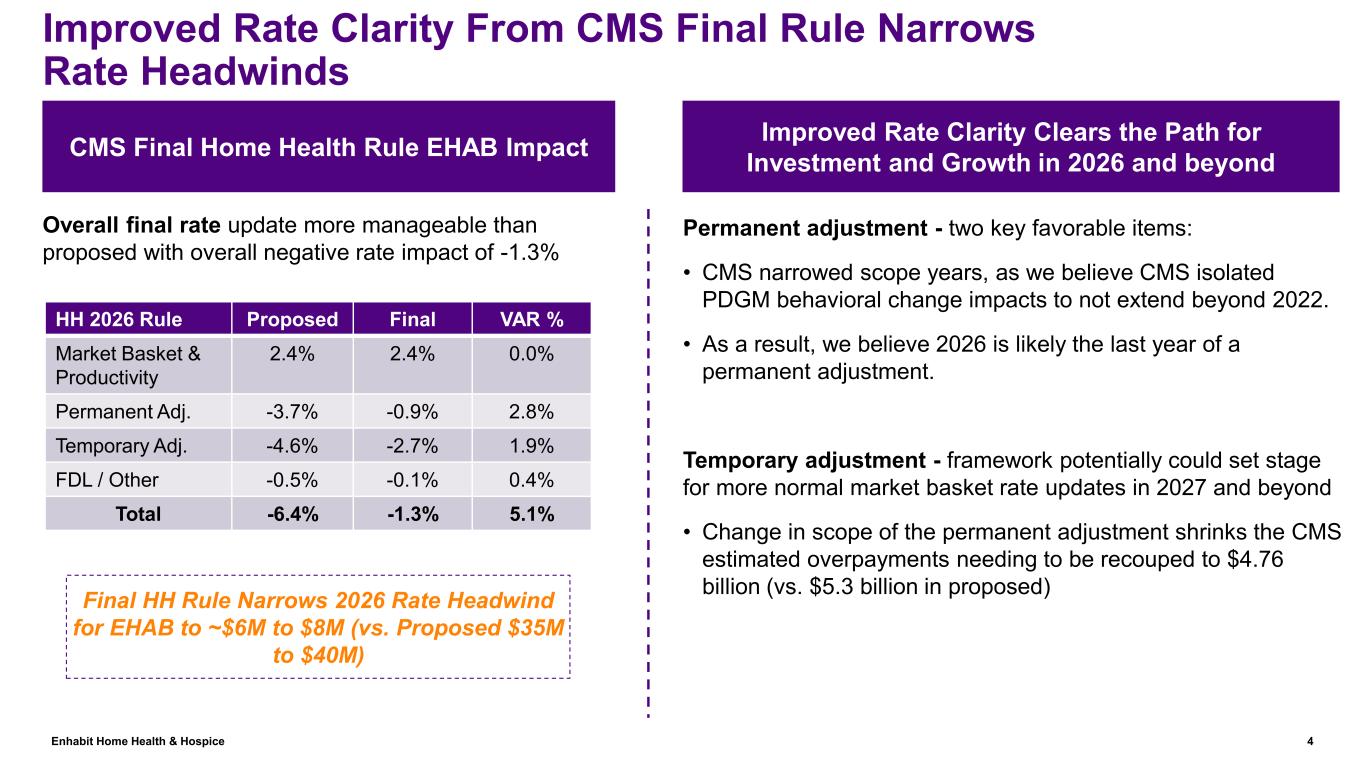 Enhabit Home Health & Hospice 3 2025 Execution Delivered an Emerging Growth Story and Improved Balance Sheet – Positioning Enhabit for Growth Emerging Growth Story Revenues +1.7% and Adj. EBITDA +7.3% Q3 YTD Improved Leverage and Free Cash Flow Provides Ability to Accelerate Growth via De Novo & Strategic M&A Q1 Q2 Q3 Q3 YTD $25.3$26.6 $25.2 $26.9 $24.5$27.0 $75.0 $80.5 +$1.3 (+5.1%) +$1.7 (+6.7%) +$2.5 (+10.2%) +$5.5 (+7.3%) 2024 2025 Q1 Q2 Q3 Q3 YTD $262.4 $259.9 $260.6 $266.1 $253.6 $263.6 $776.6 $789.6-1.0% +2.1% +3.9% +1.7% Consolidated Net Service Revenue ($s in Millions) Consolidated Adj. EBITDA ($s in Millions) 2024 2025 5.4 5.3 5.1 4.8 4.9 4.4 4.3 3.9 Q4 ’23 Q1 ’24 Q2 ’24 Q3 ’24 Q4 ’24 Q1 ’25 Q2 ’25 Q3 ’25 -1.5 (-28%) Net Debt Leverage Ratio Adj. Free Cash Flow ($s in Millions) Q3 YTD $58.3 $64.8 +$6.5 (+11.1% 2024 2025