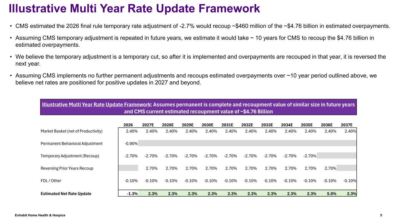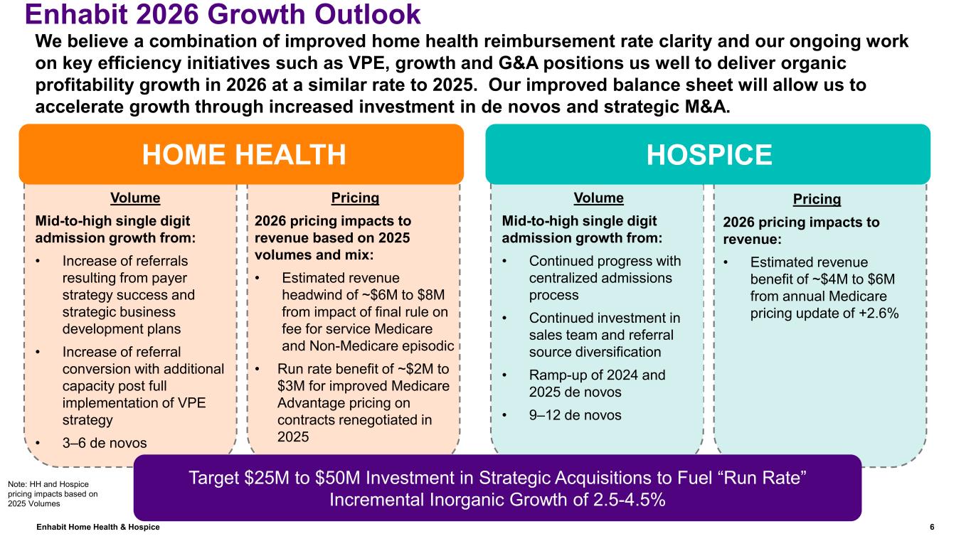 Enhabit Home Health & Hospice 5 Illustrative Multi Year Rate Update Framework • CMS estimated the 2026 final rule temporary rate adjustment of -2.7% would recoup ~$460 million of the ~$4.76 billion in estimated overpayments. • Assuming CMS temporary adjustment is repeated in future years, we estimate it would take ~ 10 years for CMS to recoup the $4.76 billion in estimated overpayments. • We believe the temporary adjustment is a temporary cut, so after it is implemented and overpayments are recouped in that year, it is reversed the next year. • Assuming CMS implements no further permanent adjustments and recoups estimated overpayments over ~10 year period outlined above, we believe net rates are positioned for positive updates in 2027 and beyond. Illustrative Multi Year Rate Update Framework: Assumes permanent is complete and recoupment value of similar size in future years and CMS current estimated recoupment value of ~$4.76 Billion 2026 2027E 2028E 2029E 2030E 2031E 2032E 2033E 2034E 2035E 2036E 2037E Market Basket (net of Productivity) 2.40% 2.40% 2.40% 2.40% 2.40% 2.40% 2.40% 2.40% 2.40% 2.40% 2.40% 2.40% Permanent Behavioral Adjustment -0.90% Temporary Adjustment (Recoup) -2.70% -2.70% -2.70% -2.70% -2.70% -2.70% -2.70% -2.70% -2.70% -2.70% Reversing Prior Years Recoup 2.70% 2.70% 2.70% 2.70% 2.70% 2.70% 2.70% 2.70% 2.70% 2.70% FDL / Other -0.10% -0.10% -0.10% -0.10% -0.10% -0.10% -0.10% -0.10% -0.10% -0.10% -0.10% -0.10% Estimated Net Rate Update -1.3% 2.3% 2.3% 2.3% 2.3% 2.3% 2.3% 2.3% 2.3% 2.3% 5.0% 2.3%