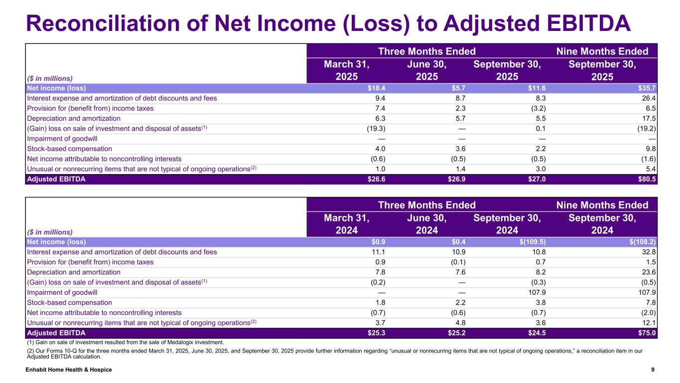 Enhabit Home Health & Hospice 9 Reconciliation of Net Income (Loss) to Adjusted EBITDA ($ in millions) Three Months Ended Nine Months Ended March 31, June 30, September 30, September 30, 2025 2025 2025 2025 Net income (loss) $18.4 $5.7 $11.6 $35.7 Interest expense and amortization of debt discounts and fees 9.4 8.7 8.3 26.4 Provision for (benefit from) income taxes 7.4 2.3 (3.2) 6.5 Depreciation and amortization 6.3 5.7 5.5 17.5 (Gain) loss on sale of investment and disposal of assets(1) (19.3) — 0.1 (19.2) Impairment of goodwill — — — — Stock-based compensation 4.0 3.6 2.2 9.8 Net income attributable to noncontrolling interests (0.6) (0.5) (0.5) (1.6) Unusual or nonrecurring items that are not typical of ongoing operations(2) 1.0 1.4 3.0 5.4 Adjusted EBITDA $26.6 $26.9 $27.0 $80.5 ($ in millions) Three Months Ended Nine Months Ended March 31, June 30, September 30, September 30, 2024 2024 2024 2024 Net income (loss) $0.9 $0.4 $(109.5) $(108.2) Interest expense and amortization of debt discounts and fees 11.1 10.9 10.8 32.8 Provision for (benefit from) income taxes 0.9 (0.1) 0.7 1.5 Depreciation and amortization 7.8 7.6 8.2 23.6 (Gain) loss on sale of investment and disposal of assets(1) (0.2) — (0.3) (0.5) Impairment of goodwill — — 107.9 107.9 Stock-based compensation 1.8 2.2 3.8 7.8 Net income attributable to noncontrolling interests (0.7) (0.6) (0.7) (2.0) Unusual or nonrecurring items that are not typical of ongoing operations(2) 3.7 4.8 3.6 12.1 Adjusted EBITDA $25.3 $25.2 $24.5 $75.0 (1) Gain on sale of investment resulted from the sale of Medalogix investment. (2) Our Forms 10-Q for the three months ended March 31, 2025, June 30, 2025, and September 30, 2025 provide further information regarding “unusual or nonrecurring items that are not typical of ongoing operations,” a reconciliation item in our Adjusted EBITDA calculation.