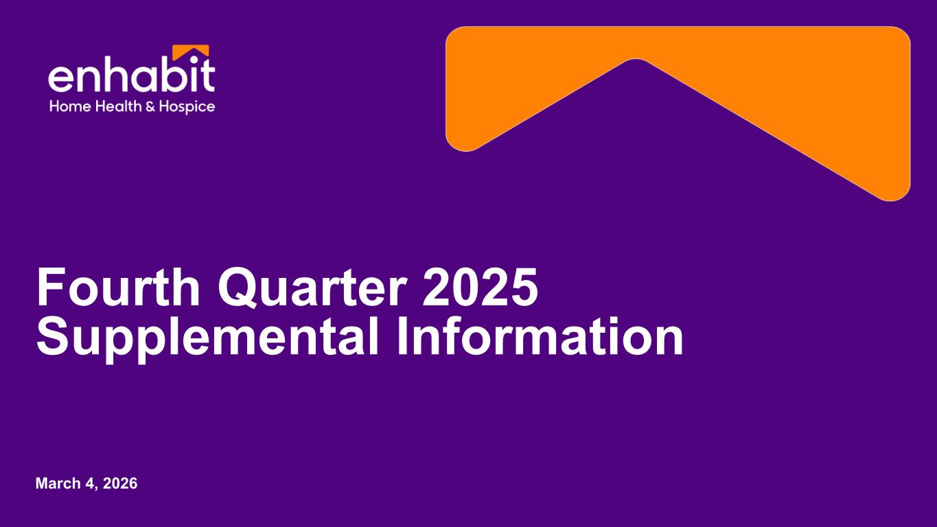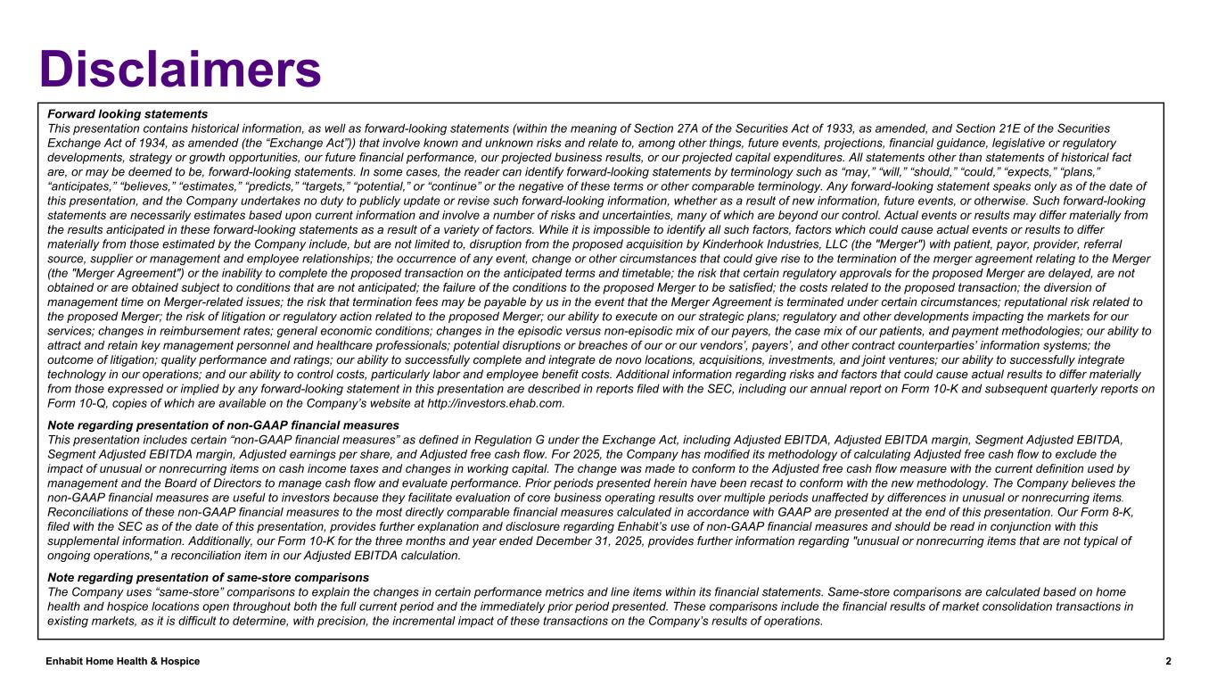 Enhabit Home Health & Hospice 2 Disclaimers Forward looking statements This presentation contains historical information, as well as forward-looking statements (within the meaning of Section 27A of the Securities Act of 1933, as amended, and Section 21E of the Securities Exchange Act of 1934, as amended (the “Exchange Act”)) that involve known and unknown risks and relate to, among other things, future events, projections, financial guidance, legislative or regulatory developments, strategy or growth opportunities, our future financial performance, our projected business results, or our projected capital expenditures. All statements other than statements of historical fact are, or may be deemed to be, forward-looking statements. In some cases, the reader can identify forward-looking statements by terminology such as “may,” “will,” “should,” “could,” “expects,” “plans,” “anticipates,” “believes,” “estimates,” “predicts,” “targets,” “potential,” or “continue” or the negative of these terms or other comparable terminology. Any forward-looking statement speaks only as of the date of this presentation, and the Company undertakes no duty to publicly update or revise such forward-looking information, whether as a result of new information, future events, or otherwise. Such forward-looking statements are necessarily estimates based upon current information and involve a number of risks and uncertainties, many of which are beyond our control. Actual events or results may differ materially from the results anticipated in these forward-looking statements as a result of a variety of factors. While it is impossible to identify all such factors, factors which could cause actual events or results to differ materially from those estimated by the Company include, but are not limited to, disruption from the proposed acquisition by Kinderhook Industries, LLC (the "Merger") with patient, payor, provider, referral source, supplier or management and employee relationships; the occurrence of any event, change or other circumstances that could give rise to the termination of the merger agreement relating to the Merger (the "Merger Agreement") or the inability to complete the proposed transaction on the anticipated terms and timetable; the risk that certain regulatory approvals for the proposed Merger are delayed, are not obtained or are obtained subject to conditions that are not anticipated; the failure of the conditions to the proposed Merger to be satisfied; the costs related to the proposed transaction; the diversion of management time on Merger-related issues; the risk that termination fees may be payable by us in the event that the Merger Agreement is terminated under certain circumstances; reputational risk related to the proposed Merger; the risk of litigation or regulatory action related to the proposed Merger; our ability to execute on our strategic plans; regulatory and other developments impacting the markets for our services; changes in reimbursement rates; general economic conditions; changes in the episodic versus non-episodic mix of our payers, the case mix of our patients, and payment methodologies; our ability to attract and retain key management personnel and healthcare professionals; potential disruptions or breaches of our or our vendors’, payers’, and other contract counterparties’ information systems; the outcome of litigation; quality performance and ratings; our ability to successfully complete and integrate de novo locations, acquisitions, investments, and joint ventures; our ability to successfully integrate technology in our operations; and our ability to control costs, particularly labor and employee benefit costs. Additional information regarding risks and factors that could cause actual results to differ materially from those expressed or implied by any forward-looking statement in this presentation are described in reports filed with the SEC, including our annual report on Form 10-K and subsequent quarterly reports on Form 10-Q, copies of which are available on the Company’s website at http://investors.ehab.com. Note regarding presentation of non-GAAP financial measures This presentation includes certain “non-GAAP financial measures” as defined in Regulation G under the Exchange Act, including Adjusted EBITDA, Adjusted EBITDA margin, Segment Adjusted EBITDA, Segment Adjusted EBITDA margin, Adjusted earnings per share, and Adjusted free cash flow. For 2025, the Company has modified its methodology of calculating Adjusted free cash flow to exclude the impact of unusual or nonrecurring items on cash income taxes and changes in working capital. The change was made to conform to the Adjusted free cash flow measure with the current definition used by management and the Board of Directors to manage cash flow and evaluate performance. Prior periods presented herein have been recast to conform with the new methodology. The Company believes the non-GAAP financial measures are useful to investors because they facilitate evaluation of core business operating results over multiple periods unaffected by differences in unusual or nonrecurring items. Reconciliations of these non-GAAP financial measures to the most directly comparable financial measures calculated in accordance with GAAP are presented at the end of this presentation. Our Form 8-K, filed with the SEC as of the date of this presentation, provides further explanation and disclosure regarding Enhabit’s use of non-GAAP financial measures and should be read in conjunction with this supplemental information. Additionally, our Form 10-K for the three months and year ended December 31, 2025, provides further information regarding "unusual or nonrecurring items that are not typical of ongoing operations," a reconciliation item in our Adjusted EBITDA calculation. Note regarding presentation of same-store comparisons The Company uses “same-store” comparisons to explain