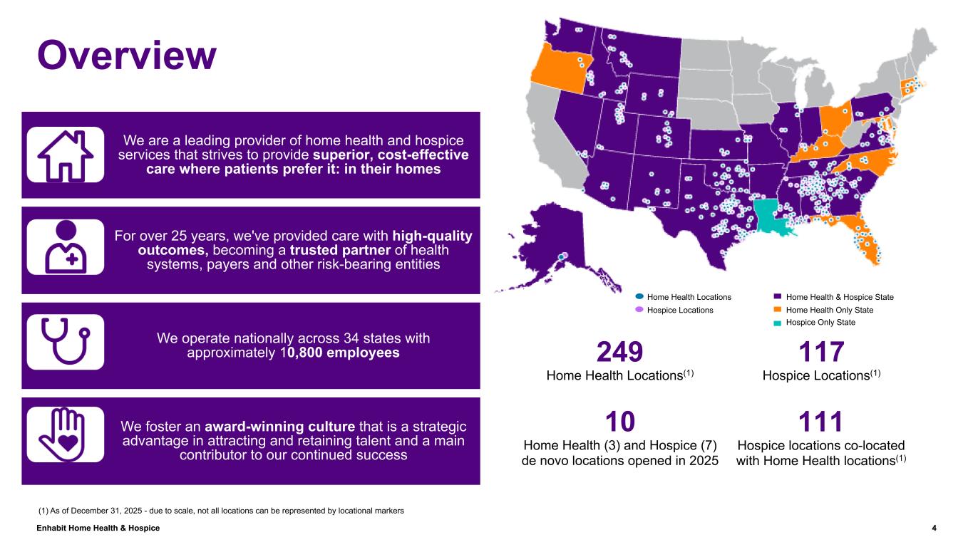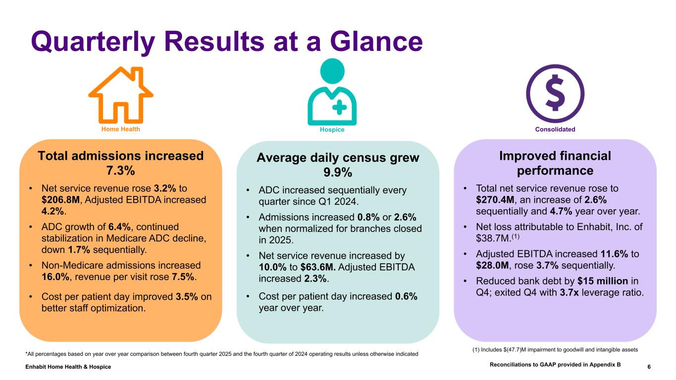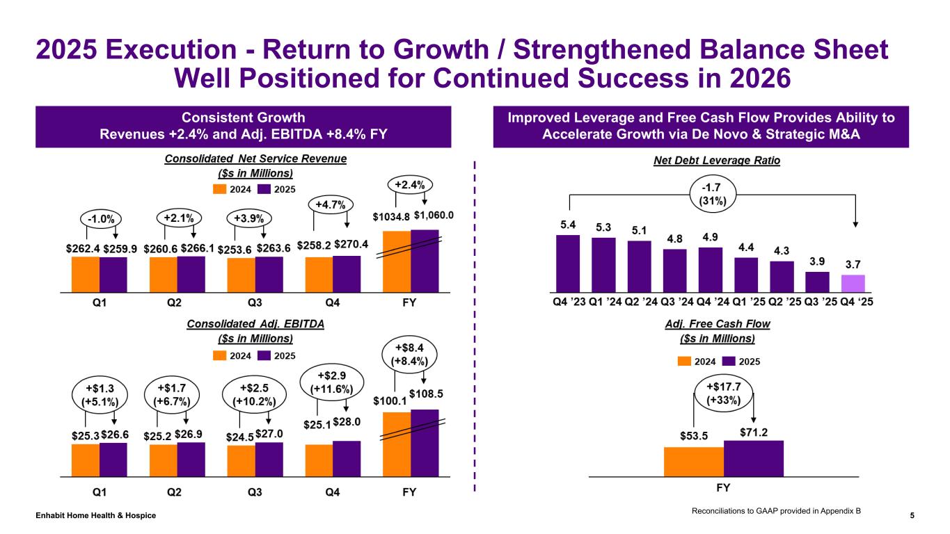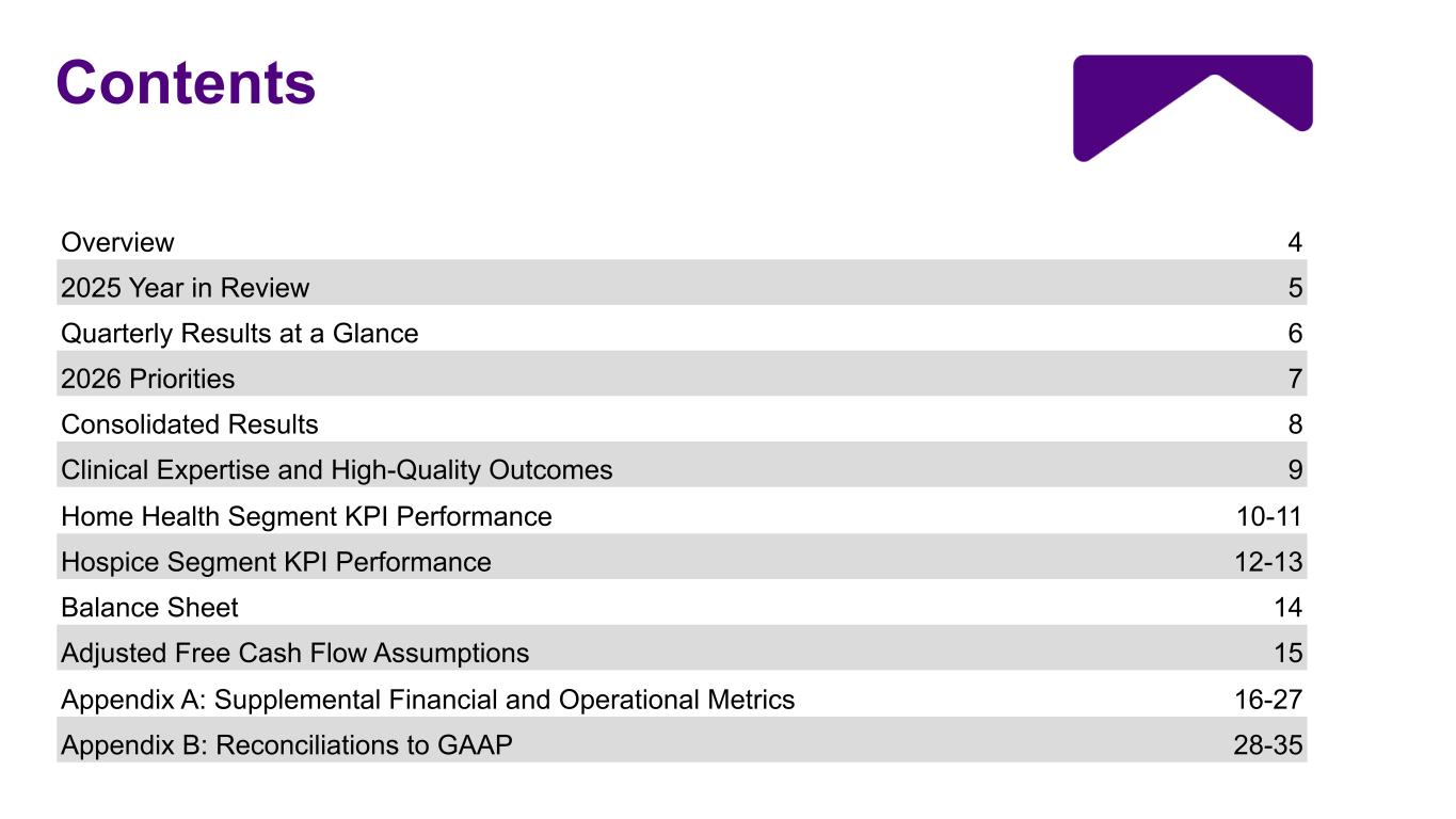 Contents Overview 4 2025 Year in Review 5 Quarterly Results at a Glance 6 2026 Priorities 7 Consolidated Results 8 Clinical Expertise and High-Quality Outcomes 9 Home Health Segment KPI Performance 10-11 Hospice Segment KPI Performance 12-13 Balance Sheet 14 Adjusted Free Cash Flow Assumptions 15 Appendix A: Supplemental Financial and Operational Metrics 16-27 Appendix B: Reconciliations to GAAP 28-35