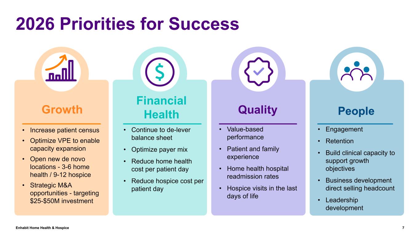 Enhabit Home Health & Hospice 6 Improved financial performance • Total net service revenue rose to $270.4M, an increase of 2.6% sequentially and 4.7% year over year. • Net loss attributable to Enhabit, Inc. of $38.7M.(1) • Adjusted EBITDA increased 11.6% to $28.0M, rose 3.7% sequentially. • Reduced bank debt by $15 million in Q4; exited Q4 with 3.7x leverage ratio. Quarterly Results at a Glance Total admissions increased 7.3% • Net service revenue rose 3.2% to $206.8M, Adjusted EBITDA increased 4.2%. • ADC growth of 6.4%, continued stabilization in Medicare ADC decline, down 1.7% sequentially. • Non-Medicare admissions increased 16.0%, revenue per visit rose 7.5%. • Cost per patient day improved 3.5% on better staff optimization. Average daily census grew 9.9% • ADC increased sequentially every quarter since Q1 2024. • Admissions increased 0.8% or 2.6% when normalized for branches closed in 2025. • Net service revenue increased by 10.0% to $63.6M. Adjusted EBITDA increased 2.3%. • Cost per patient day increased 0.6% year over year. Home Health Hospice Consolidated *All percentages based on year over year comparison between fourth quarter 2025 and the fourth quarter of 2024 operating results unless otherwise indicated (1) Includes $(47.7)M impairment to goodwill and intangible assets Reconciliations to GAAP provided in Appendix B