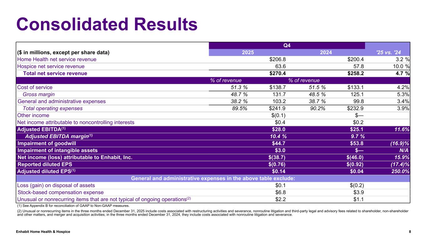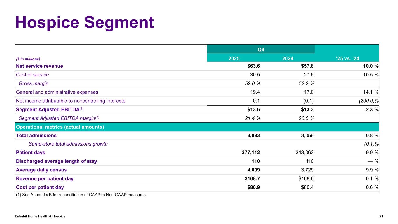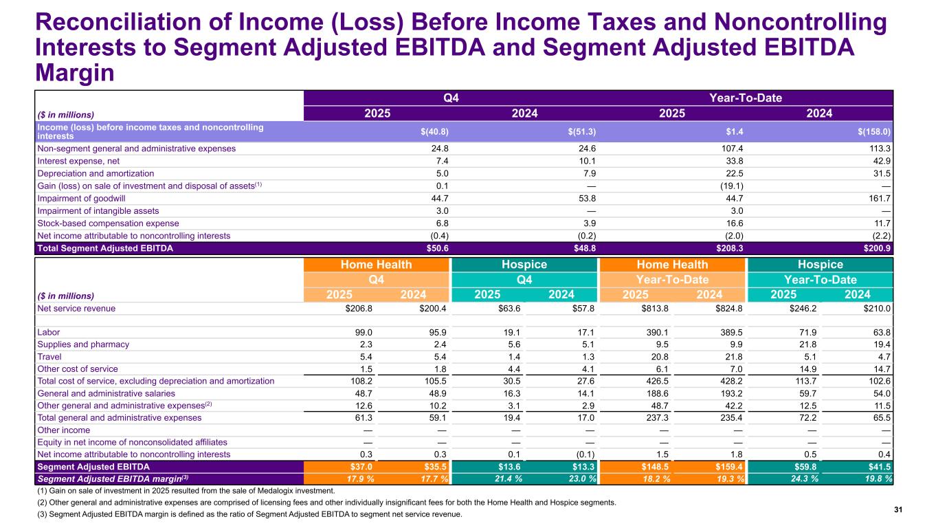 Enhabit Home Health & Hospice 31 Q4 Year-To-Date ($ in millions) 2025 2024 2025 2024 Income (loss) before income taxes and noncontrolling interests $(40.8) $(51.3) $1.4 $(158.0) Non-segment general and administrative expenses 24.8 24.6 107.4 113.3 Interest expense, net 7.4 10.1 33.8 42.9 Depreciation and amortization 5.0 7.9 22.5 31.5 Gain (loss) on sale of investment and disposal of assets(1) 0.1 — (19.1) — Impairment of goodwill 44.7 53.8 44.7 161.7 Impairment of intangible assets 3.0 — 3.0 — Stock-based compensation expense 6.8 3.9 16.6 11.7 Net income attributable to noncontrolling interests (0.4) (0.2) (2.0) (2.2) Total Segment Adjusted EBITDA $50.6 $48.8 $208.3 $200.9 Home Health Hospice Home Health Hospice Q4 Q4 Year-To-Date Year-To-Date ($ in millions) 2025 2024 2025 2024 2025 2024 2025 2024 Net service revenue $206.8 $200.4 $63.6 $57.8 $813.8 $824.8 $246.2 $210.0 Labor 99.0 95.9 19.1 17.1 390.1 389.5 71.9 63.8 Supplies and pharmacy 2.3 2.4 5.6 5.1 9.5 9.9 21.8 19.4 Travel 5.4 5.4 1.4 1.3 20.8 21.8 5.1 4.7 Other cost of service 1.5 1.8 4.4 4.1 6.1 7.0 14.9 14.7 Total cost of service, excluding depreciation and amortization 108.2 105.5 30.5 27.6 426.5 428.2 113.7 102.6 General and administrative salaries 48.7 48.9 16.3 14.1 188.6 193.2 59.7 54.0 Other general and administrative expenses(2) 12.6 10.2 3.1 2.9 48.7 42.2 12.5 11.5 Total general and administrative expenses 61.3 59.1 19.4 17.0 237.3 235.4 72.2 65.5 Other income — — — — — — — — Equity in net income of nonconsolidated affiliates — — — — — — — — Net income attributable to noncontrolling interests 0.3 0.3 0.1 (0.1) 1.5 1.8 0.5 0.4 Segment Adjusted EBITDA $37.0 $35.5 $13.6 $13.3 $148.5 $159.4 $59.8 $41.5 Segment Adjusted EBITDA margin(3) 17.9 % 17.7 % 21.4 % 23.0 % 18.2 % 19.3 % 24.3 % 19.8 % (1) Gain on sale of investment in 2025 resulted from the sale of Medalogix investment. (2) Other general and administrative expenses are comprised of licensing fees and other individually insignificant fees for both the Home Health and Hospice segments. (3) Segment Adjusted EBITDA margin is defined as the ratio of Segment Adjusted EBITDA to segment net service revenue. Reconciliation of Income (Loss) Before Income Taxes and Noncontrolling Interests to Segment Adjusted EBITDA and Segment Adjusted EBITDA Margin