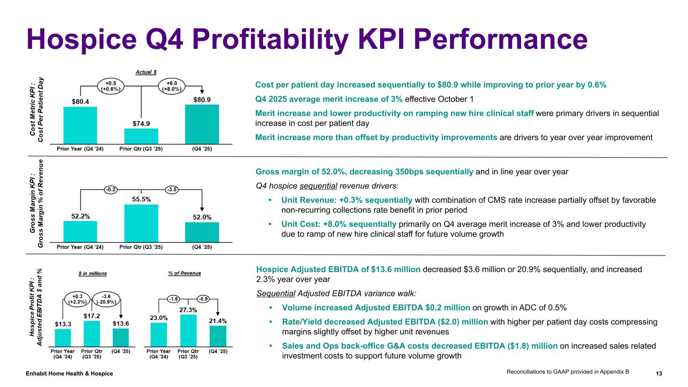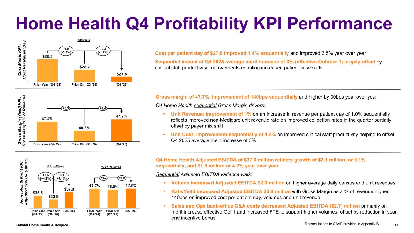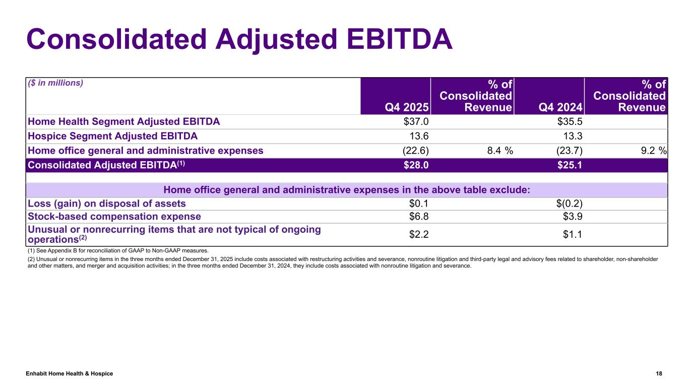 Enhabit Home Health & Hospice 31 Q4 Year-To-Date ($ in millions) 2025 2024 2025 2024 Income (loss) before income taxes and noncontrolling interests $(40.8) $(51.3) $1.4 $(158.0) Non-segment general and administrative expenses 24.8 24.6 107.4 113.3 Interest expense, net 7.4 10.1 33.8 42.9 Depreciation and amortization 5.0 7.9 22.5 31.5 Gain (loss) on sale of investment and disposal of assets(1) 0.1 — (19.1) — Impairment of goodwill 44.7 53.8 44.7 161.7 Impairment of intangible assets 3.0 — 3.0 — Stock-based compensation expense 6.8 3.9 16.6 11.7 Net income attributable to noncontrolling interests (0.4) (0.2) (2.0) (2.2) Total Segment Adjusted EBITDA $50.6 $48.8 $208.3 $200.9 Home Health Hospice Home Health Hospice Q4 Q4 Year-To-Date Year-To-Date ($ in millions) 2025 2024 2025 2024 2025 2024 2025 2024 Net service revenue $206.8 $200.4 $63.6 $57.8 $813.8 $824.8 $246.2 $210.0 Labor 99.0 95.9 19.1 17.1 390.1 389.5 71.9 63.8 Supplies and pharmacy 2.3 2.4 5.6 5.1 9.5 9.9 21.8 19.4 Travel 5.4 5.4 1.4 1.3 20.8 21.8 5.1 4.7 Other cost of service 1.5 1.8 4.4 4.1 6.1 7.0 14.9 14.7 Total cost of service, excluding depreciation and amortization 108.2 105.5 30.5 27.6 426.5 428.2 113.7 102.6 General and administrative salaries 48.7 48.9 16.3 14.1 188.6 193.2 59.7 54.0 Other general and administrative expenses(2) 12.6 10.2 3.1 2.9 48.7 42.2 12.5 11.5 Total general and administrative expenses 61.3 59.1 19.4 17.0 237.3 235.4 72.2 65.5 Other income — — — — — — — — Equity in net income of nonconsolidated affiliates — — — — — — — — Net income attributable to noncontrolling interests 0.3 0.3 0.1 (0.1) 1.5 1.8 0.5 0.4 Segment Adjusted EBITDA $37.0 $35.5 $13.6 $13.3 $148.5 $159.4 $59.8 $41.5 Segment Adjusted EBITDA margin(3) 17.9 % 17.7 % 21.4 % 23.0 % 18.2 % 19.3 % 24.3 % 19.8 % (1) Gain on sale of investment in 2025 resulted from the sale of Medalogix investment. (2) Other general and administrative expenses are comprised of licensing fees and other individually insignificant fees for both the Home Health and Hospice segments. (3) Segment Adjusted EBITDA margin is defined as the ratio of Segment Adjusted EBITDA to segment net service revenue. Reconciliation of Income (Loss) Before Income Taxes and Noncontrolling Interests to Segment Adjusted EBITDA and Segment Adjusted EBITDA Margin
