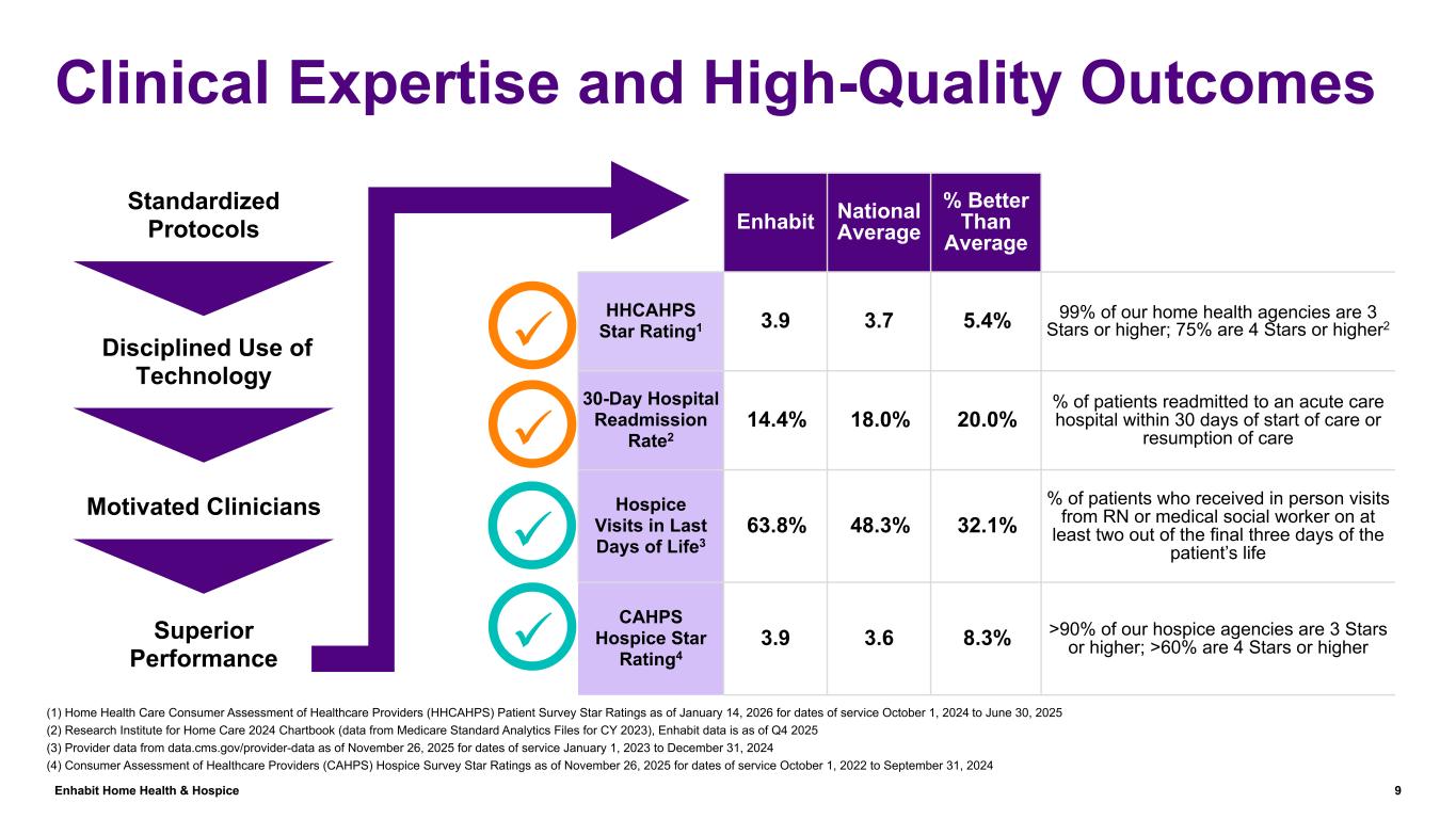 Enhabit Home Health & Hospice 8 Consolidated Results Q4 '25 vs. '24($ in millions, except per share data) 2025 2024 Home Health net service revenue $206.8 $200.4 3.2 % Hospice net service revenue 63.6 57.8 10.0 % Total net service revenue $270.4 $258.2 4.7 % % of revenue % of revenue Cost of service 51.3 % $138.7 51.5 % $133.1 4.2 % Gross margin 48.7 % 131.7 48.5 % 125.1 5.3 % General and administrative expenses 38.2 % 103.2 38.7 % 99.8 3.4 % Total operating expenses 89.5 % $241.9 90.2 % $232.9 3.9 % Other income $(0.1) $— Net income attributable to noncontrolling interests $0.4 $0.2 Adjusted EBITDA(1) $28.0 $25.1 11.6 % Adjusted EBITDA margin(1) 10.4 % 9.7 % Impairment of goodwill $44.7 $53.8 (16.9)% Impairment of intangible assets $3.0 $— N/A Net income (loss) attributable to Enhabit, Inc. $(38.7) $(46.0) 15.9 % Reported diluted EPS $(0.76) $(0.92) (17.4) % Adjusted diluted EPS(1) $0.14 $0.04 250.0 % General and administrative expenses in the above table exclude: Loss (gain) on disposal of assets $0.1 $(0.2) Stock-based compensation expense $6.8 $3.9 Unusual or nonrecurring items that are not typical of ongoing operations(2) $2.2 $1.1 (1) See Appendix B for reconciliation of GAAP to Non-GAAP measures. (2) Unusual or nonrecurring items in the three months ended December 31, 2025 include costs associated with restructuring activities and severance, nonroutine litigation and third-party legal and advisory fees related to shareholder, non-shareholder and other matters, and merger and acquisition activities; in the three months ended December 31, 2024, they include costs associated with nonroutine litigation and severance.
