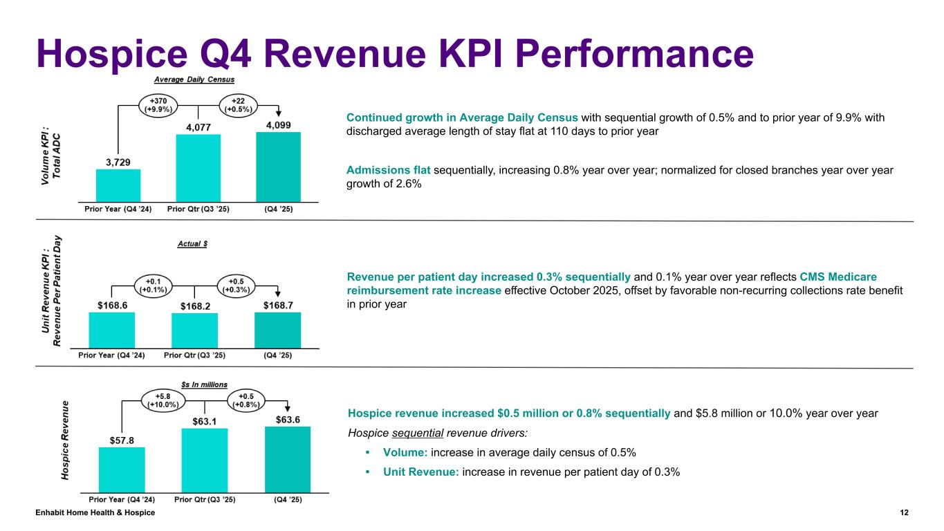 Enhabit Home Health & Hospice 11 Home Health Q4 Profitability KPI Performance Gross margin of 47.7%, improvement of 140bps sequentially and higher by 30bps year over year Q4 Home Health sequential Gross Margin drivers: • Unit Revenue: improvement of 1% on an increase in revenue per patient day of 1.0% sequentially reflects improved non-Medicare unit revenue rate on improved collection rates in the quarter partially offset by payer mix shift • Unit Cost: improvement sequentially of 1.4% on improved clinical staff productivity helping to offset Q4 2025 average merit increase of 3% Reconciliations to GAAP provided in Appendix B Q4 Home Health Adjusted EBITDA of $37.0 million reflects growth of $3.1 million, or 9.1% sequentially, and $1.5 million or 4.2% year over year Sequential Adjusted EBITDA variance walk: • Volume increased Adjusted EBITDA $2.0 million on higher average daily census and unit revenues • Rate/Yield increased Adjusted EBITDA $3.8 million with Gross Margin as a % of revenue higher 140bps on improved cost per patient day, volumes and unit revenue • Sales and Ops back-office G&A costs decreased Adjusted EBITDA ($2.7) million primarily on merit increase effective Oct 1 and increased FTE to support higher volumes, offset by reduction in year end incentive bonus Cost per patient day of $27.8 improved 1.4% sequentially and improved 3.5% year over year Sequential impact of Q4 2025 average merit increase of 3% (effective October 1) largely offset by clinical staff productivity improvements enabling increased patient caseloads